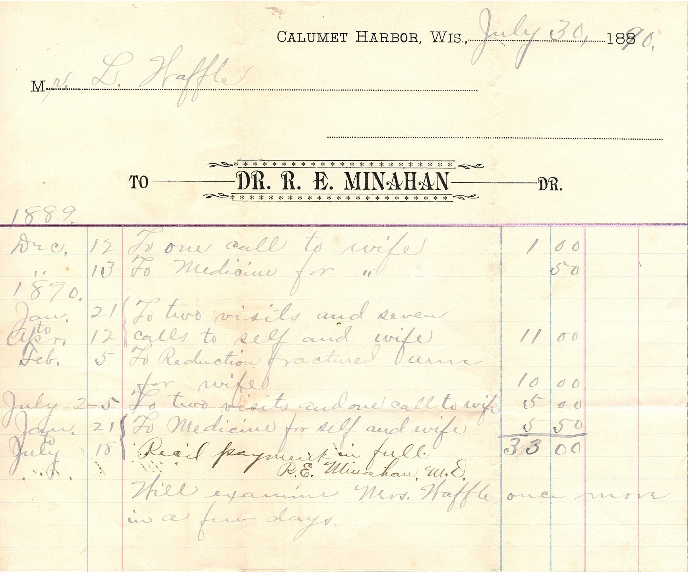 Half sheet of paper with printed letterhead and a printed grid in blue and red lines on the bottom half. The letterhead reads Dr. R.E. Minahan in Calumet Harbor, Wis. It is dated July 30, 1890 to Mr. L. Waffle. It appears to be medical bill for various visits.Collection