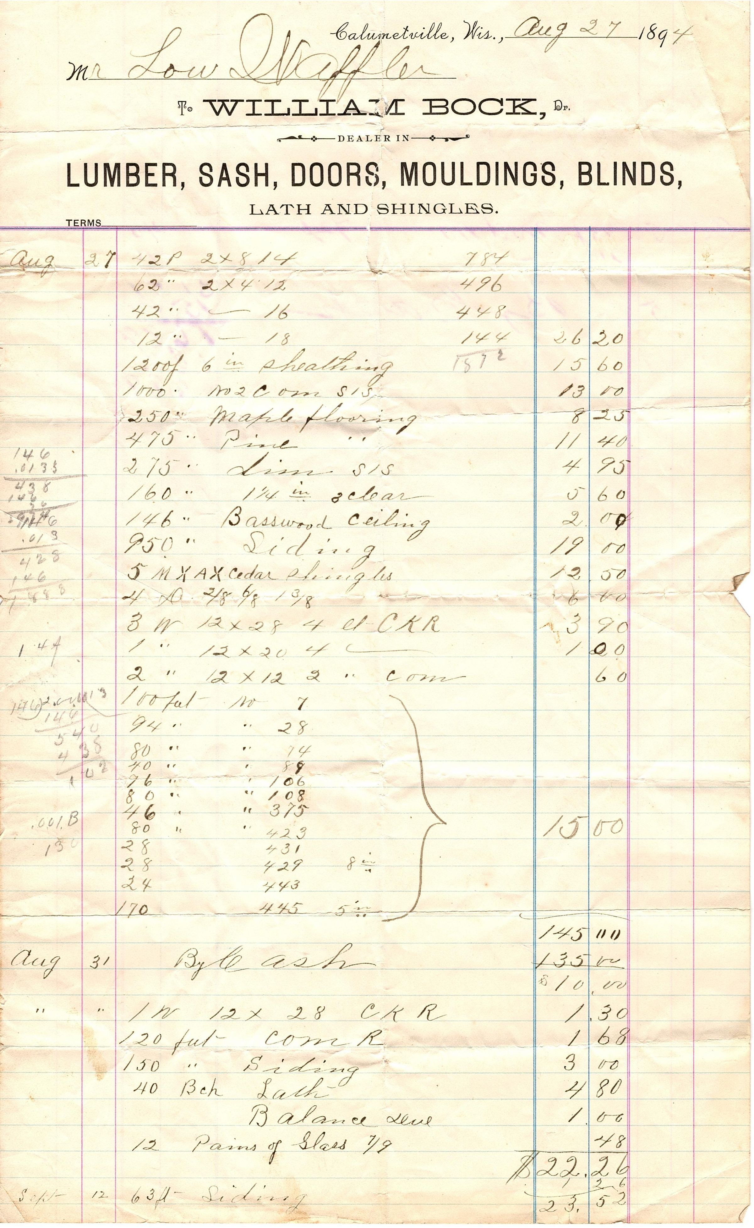 Single sheet of legal sized paper used as a form for purchases. It has columns for terms, item descriptions, and pricing. The letterhead reads "Calumetville, Wis., Aug 27 1894, Mr. Lou Waffle, to William Bock, Dr., Dealer in, Lumber, Sash, Doors, Mouldings, Blinds, Lath and Shingles." There is a list of 20-30 items and their prices that continues on the back with the header "Forward". The last few lines and calculations are written in a blue or purple pencil.Collection