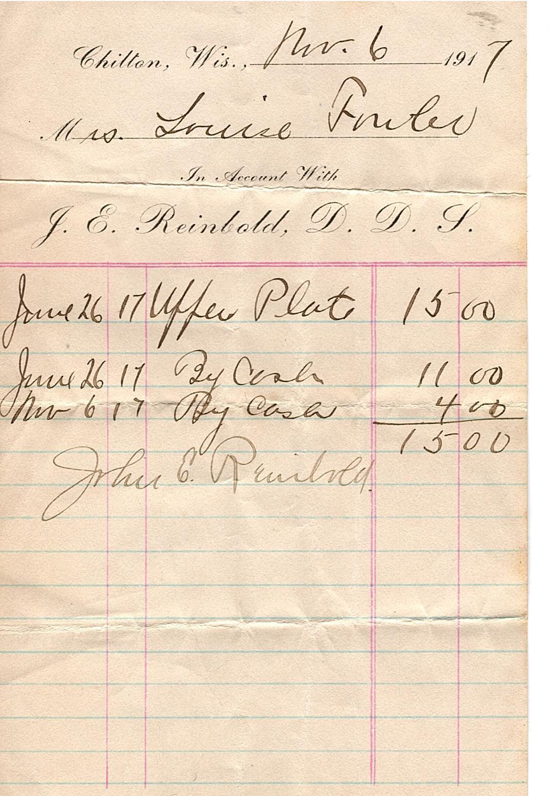 Small sheet with printed form at top filled in with black ink and a grid at the bottom in blue and red ink. The form reads "Chilton, Wis. Nov 6, 1917, Mrs. Louise Fowler. In Account With J.E. Reinhold, D.D.S." and is filled out with three dates: one corresponds to the purchase and two correspond to the payments. Singed at the bottom by John E. Reinhold.Collection