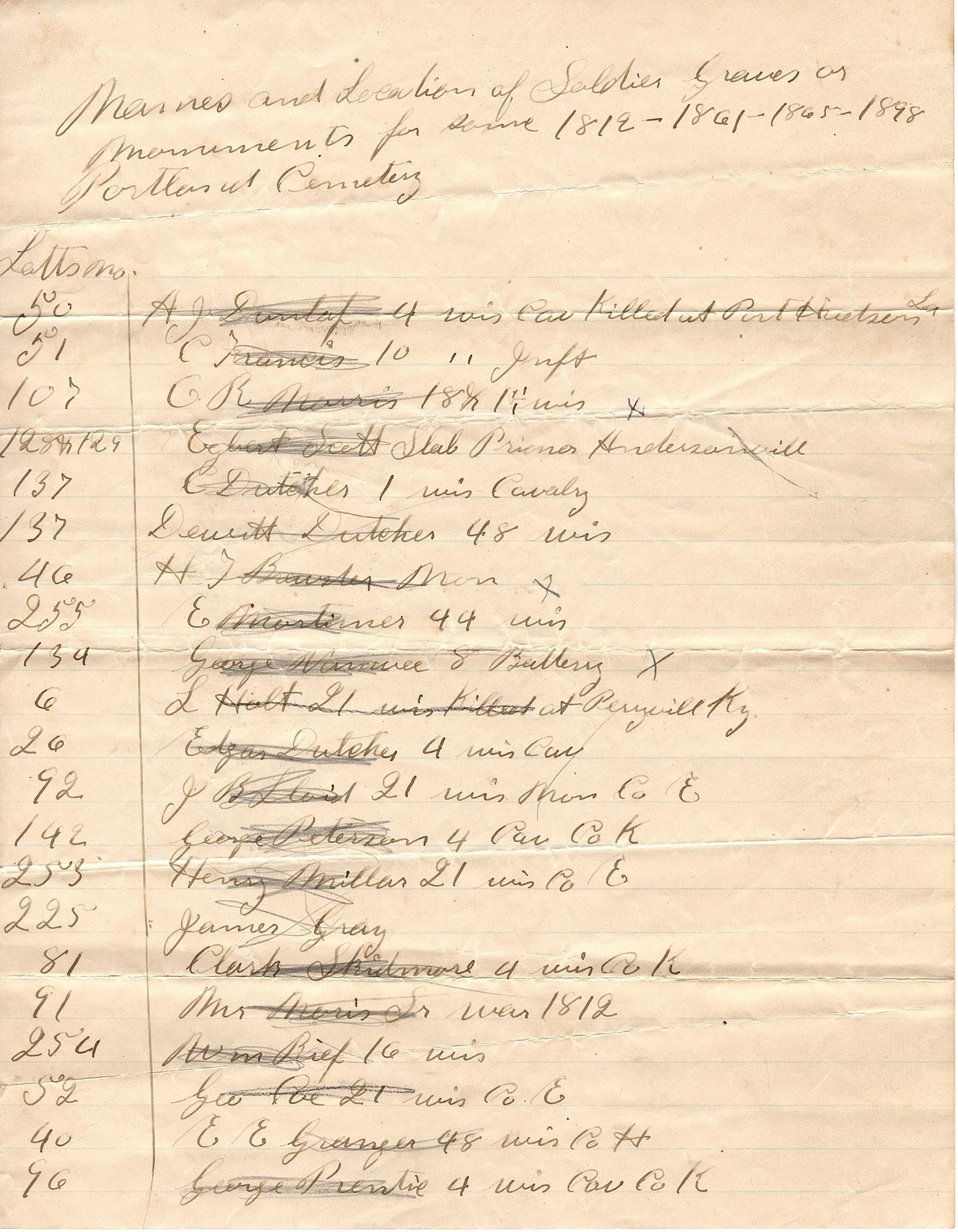 Single sheet of paper listing the "Names and location of Soldier Garaves or Monuments for some 1812-1861-1865-1898, Portland Cemetery".Collection