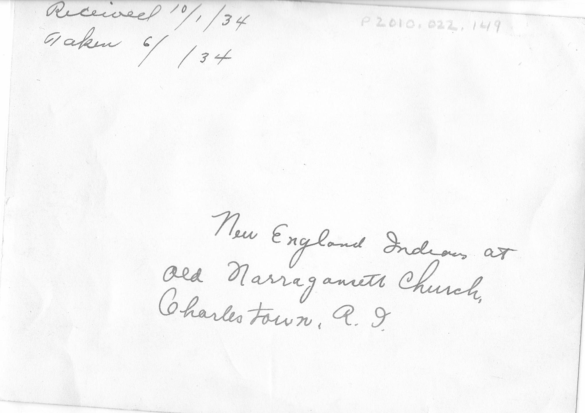 "Received 10/1/34 taken 6//34 New England Indians at Old Narragansett Church, Charlestown, R.I."Location