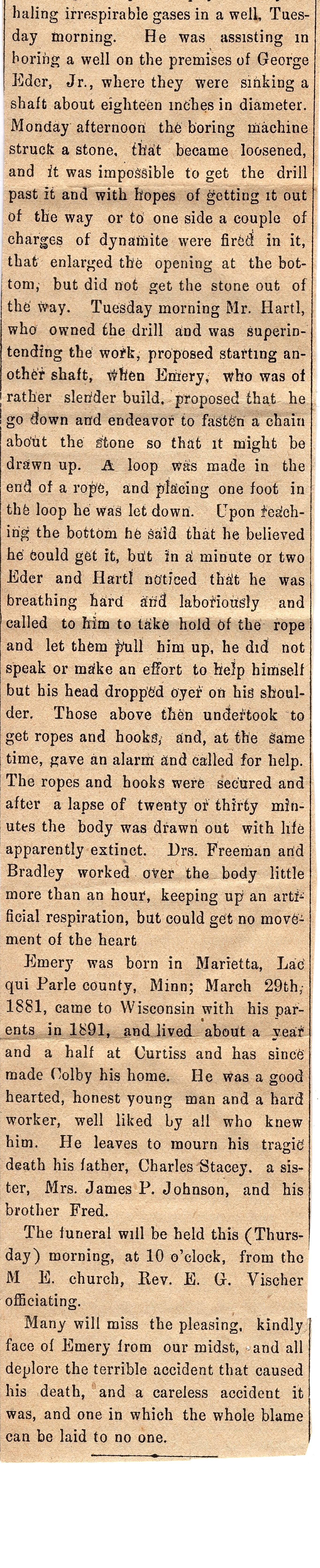 Talks about the death of Emery Stacey who died while helping dig a well from asphyxiation. It is part obituary and part story of his death. Is included with a letter from P.J. Johnson because she is this man's sister.Collection