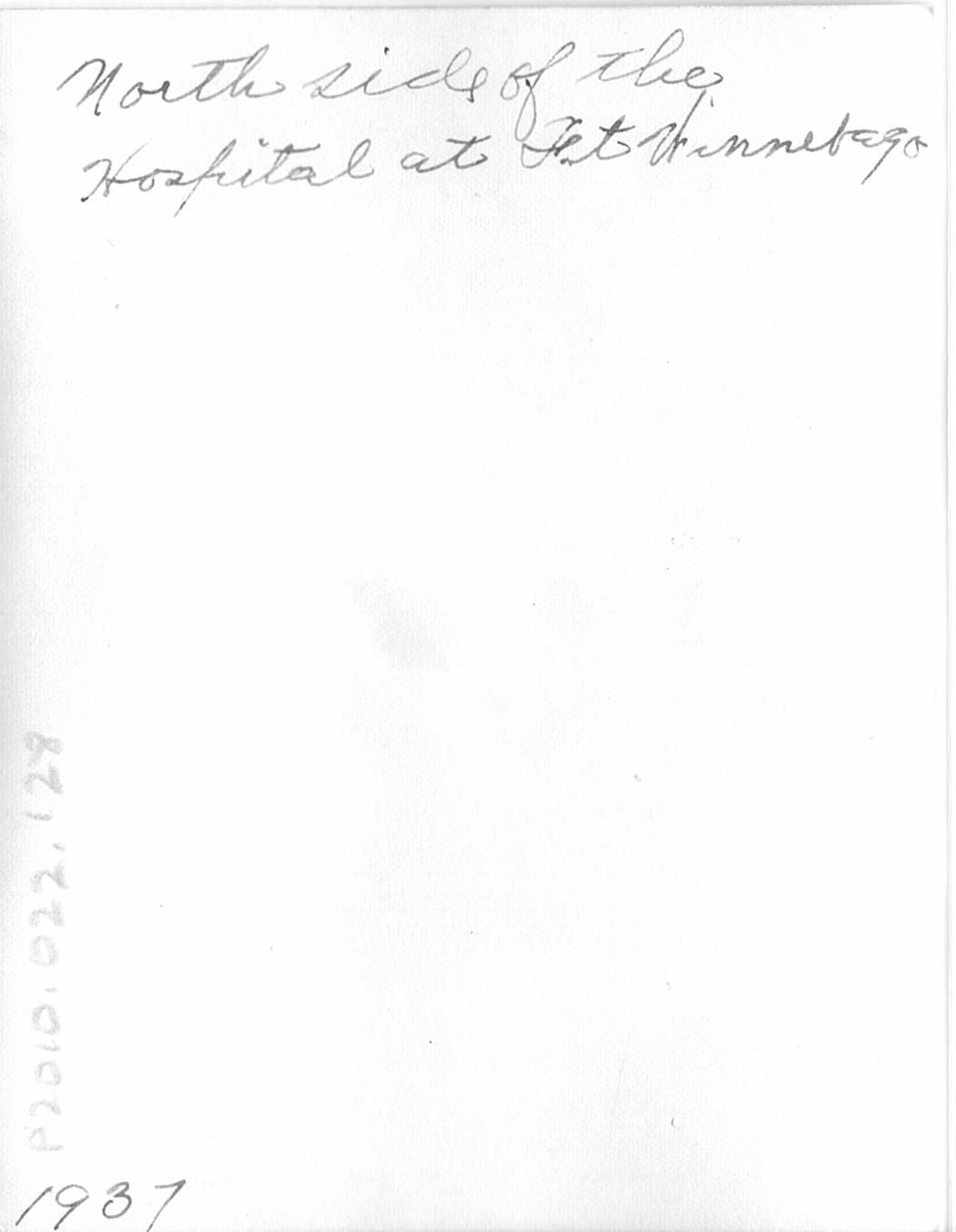 Written in black ink on the back "North side of the Hospital at Ft. Winnebago. 1937."Collection
