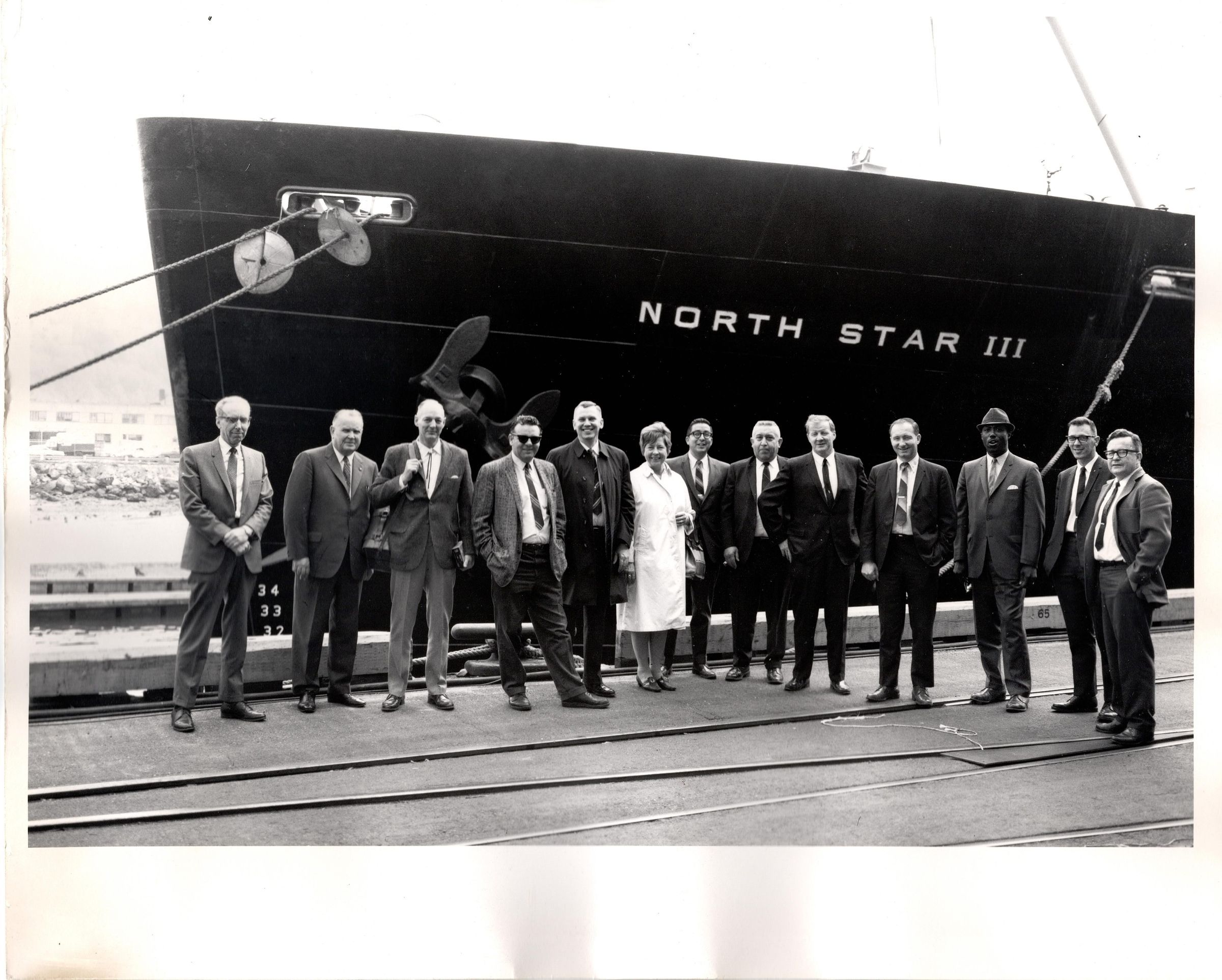 Black and white photograph of thirteen (13) people standing on the dock in front of the North Star III. There is one woman in the group standing in roughly the middle, sixth from the left and eighth from the right. The rest of the people are men in suits and ties.