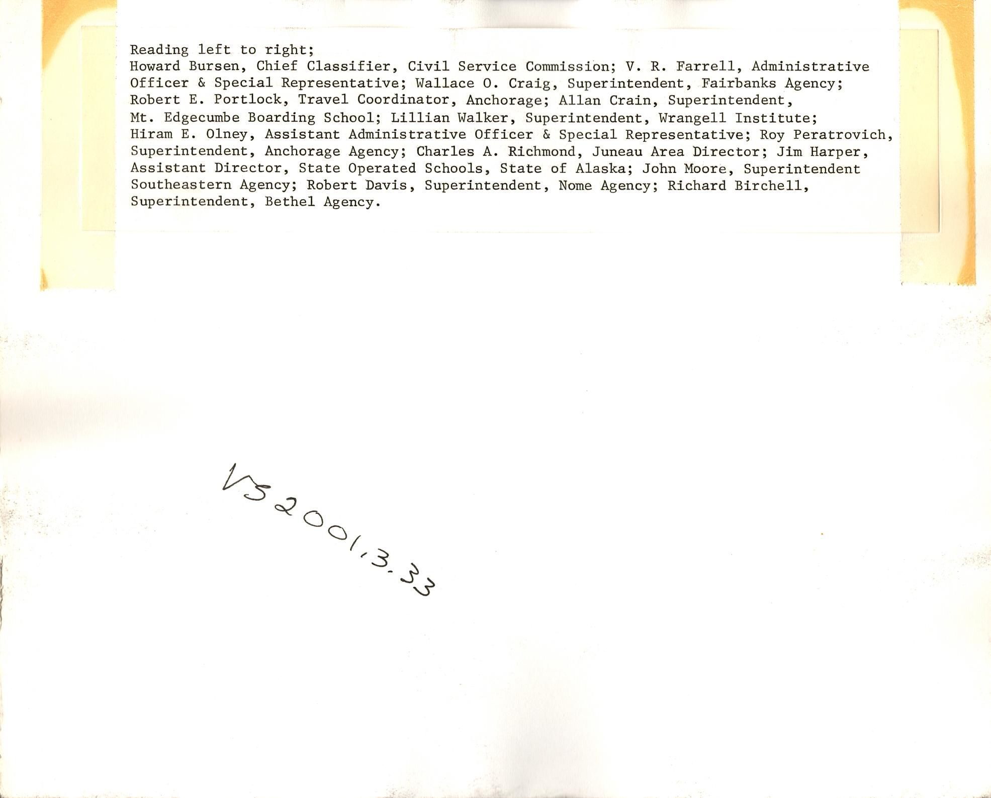 Typed on the back "Reading left to right; Howard Bursen, Chief Classifier, Civil Service Commission; V.R. Farrell, Administrative Officer & Special Representative; Wallace O. Craig, Superintendent, Fairbanks Agency; Robert E. Portlock, Travel Coordinator, Anchorage; Allan Crain, Superintendent, Mt. Edgecumbe Boarding School; Lillian Walker, Superintendent, Wrangell Institute; Hiram E. Olney, Assistant Administrative Officer & Special Representative; Roy Peratrovich, Superintendent, Anchorage Agency; Charles A. Richmond, Juneau Area Director; Jim Harper, Assistant Director, State Operated Schools, State of Alaska; John Moore, Superintendent Southeastern Agency; Robert Davis, Superintendent, Nome Agency; Richard Birchell, Superintendent, Bethel Agency."Photograph Details