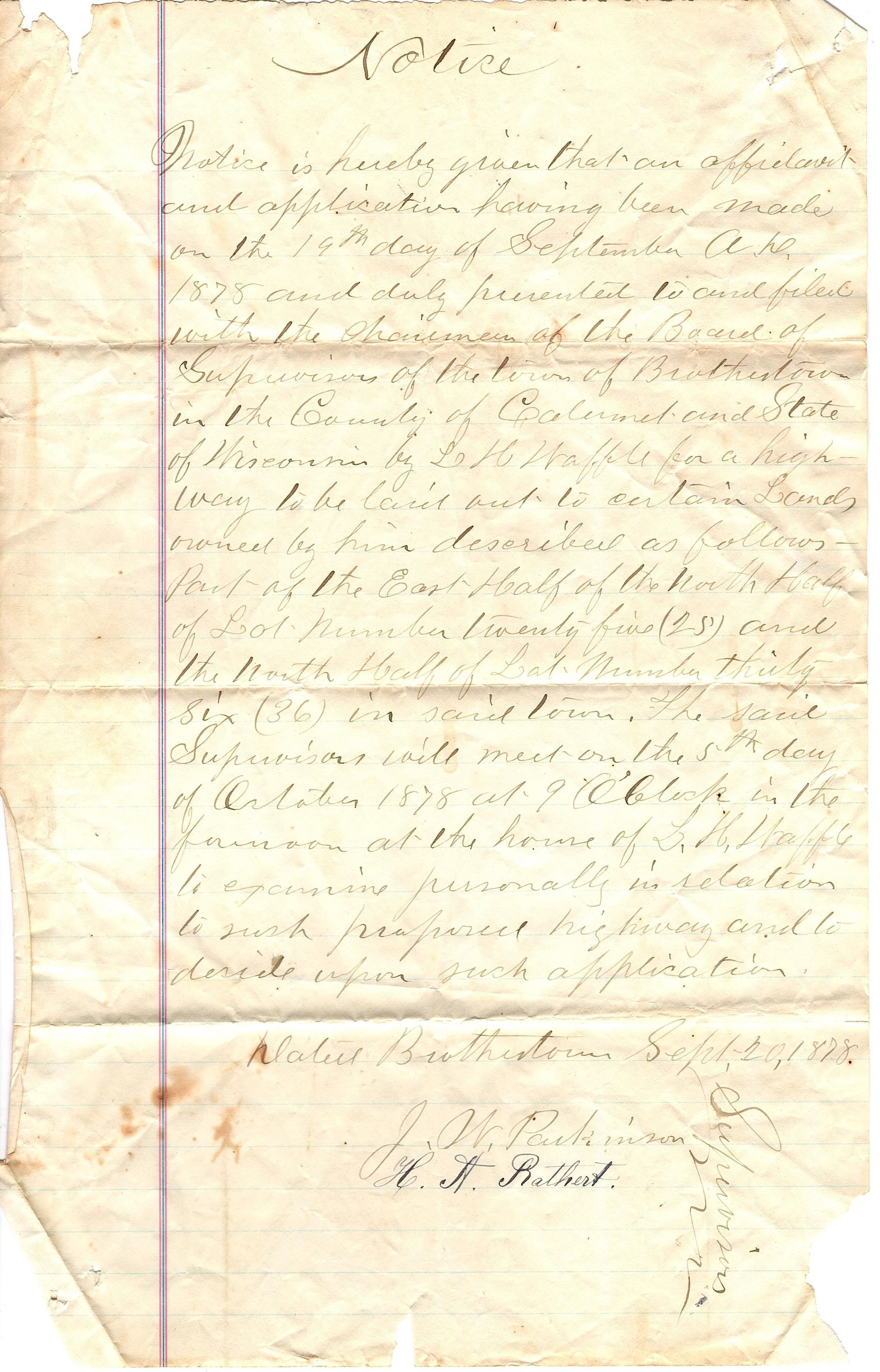 Official document-notice. AT the top of the single sheet of lined legal paper is the word "Notice". It reads "Notice is hereby given that an affidavit and application having been made on the 19th day of September A.D. 1878 and duly presented to ad filed with the Chairman of the Board of Supervisors of the town of Brothertown in the County of Calumet and State of Wisconsin by L.H. Waffle for a high way to be laid out to certain lands owned by him described as follows..." It is signed by J.W. Parkinson and H.A. Rathert.Collection