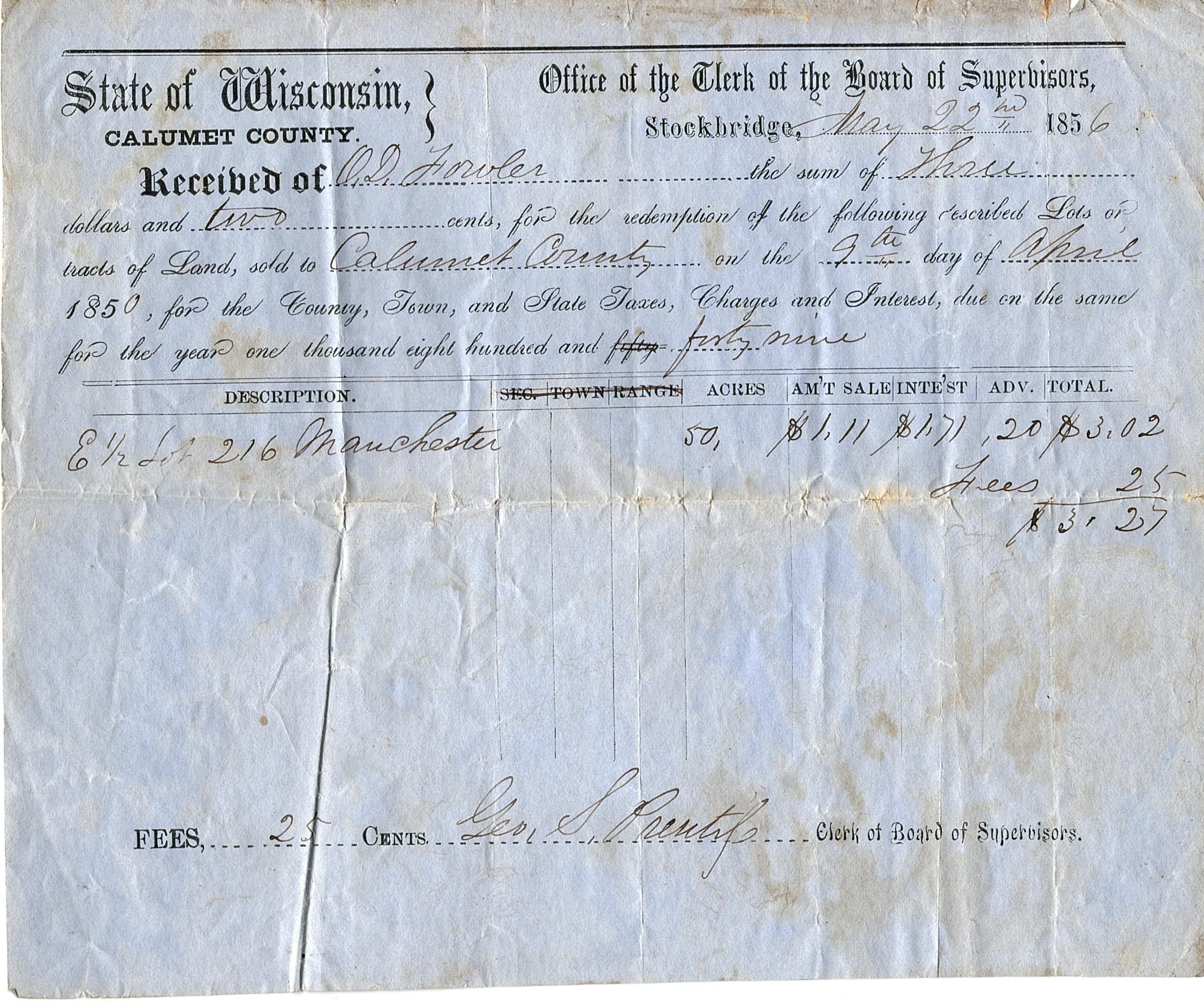 Half sheet of blue paper that starts "State of Wisconsin, Calumet County. Office of the Clerk of the Board of Supervisors." It outlines payment from O.D. Fowler of $3.02 for the redemption of the lots of land listed in the grid. It was sold on April 9th, 1850 and the taxes, charges and interest are due from 1849.Collection