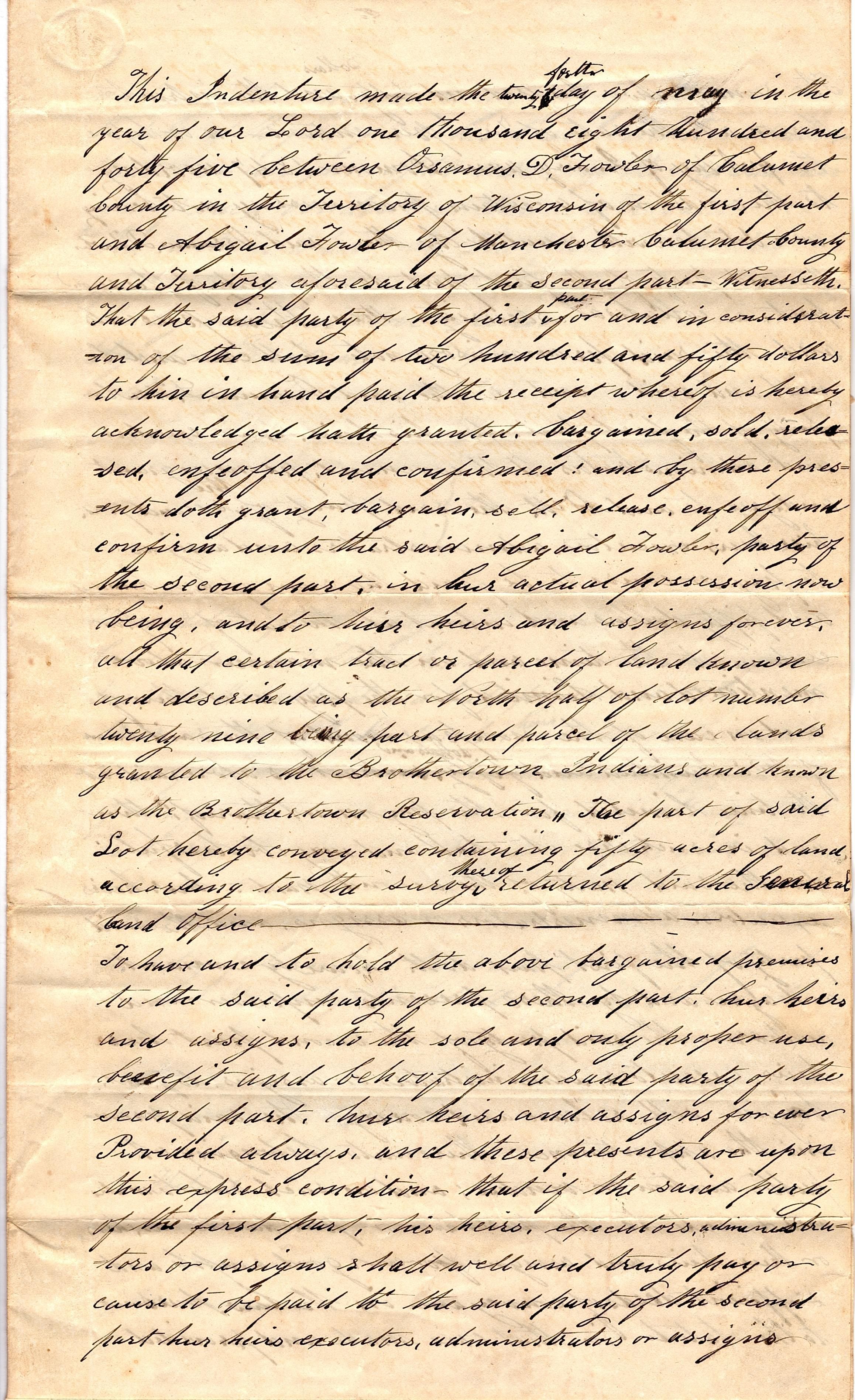 Official document-deed. O.D. Fowler to Abigail Fowler. Recorded on the sixth of August A.D. 1845. The document is a folded sheet of legal paper that creates four pages of hand written notes in black ink. There is an additional leaf of paper glued to the bottom that is written in a different direction recording when money was received. There is a stamp at the top, left corner that is oval in shape with some in the middle. It starts "This Indenture made the twenty fourth day of May in the year of our Lord one thousand eight hundred and forty five..."Collection