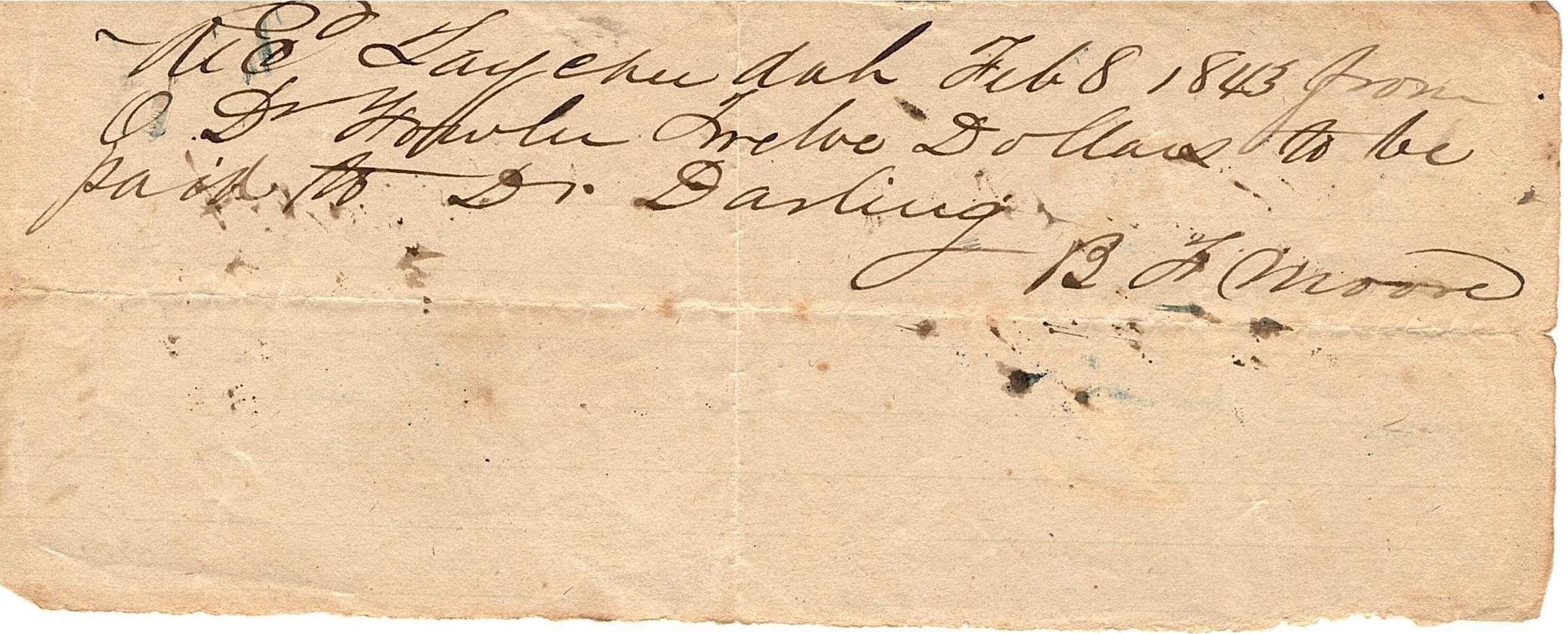 Small sheet of paper with receipt written in black ink. It reads "Rec Taycheedah Feb 8 1843 from O.D. Fowler twelve Dollars to be paid to Dr. Darling" and signed by B F Moore. Written in a different ink on the back is "B F Moore, Recpt".Collection