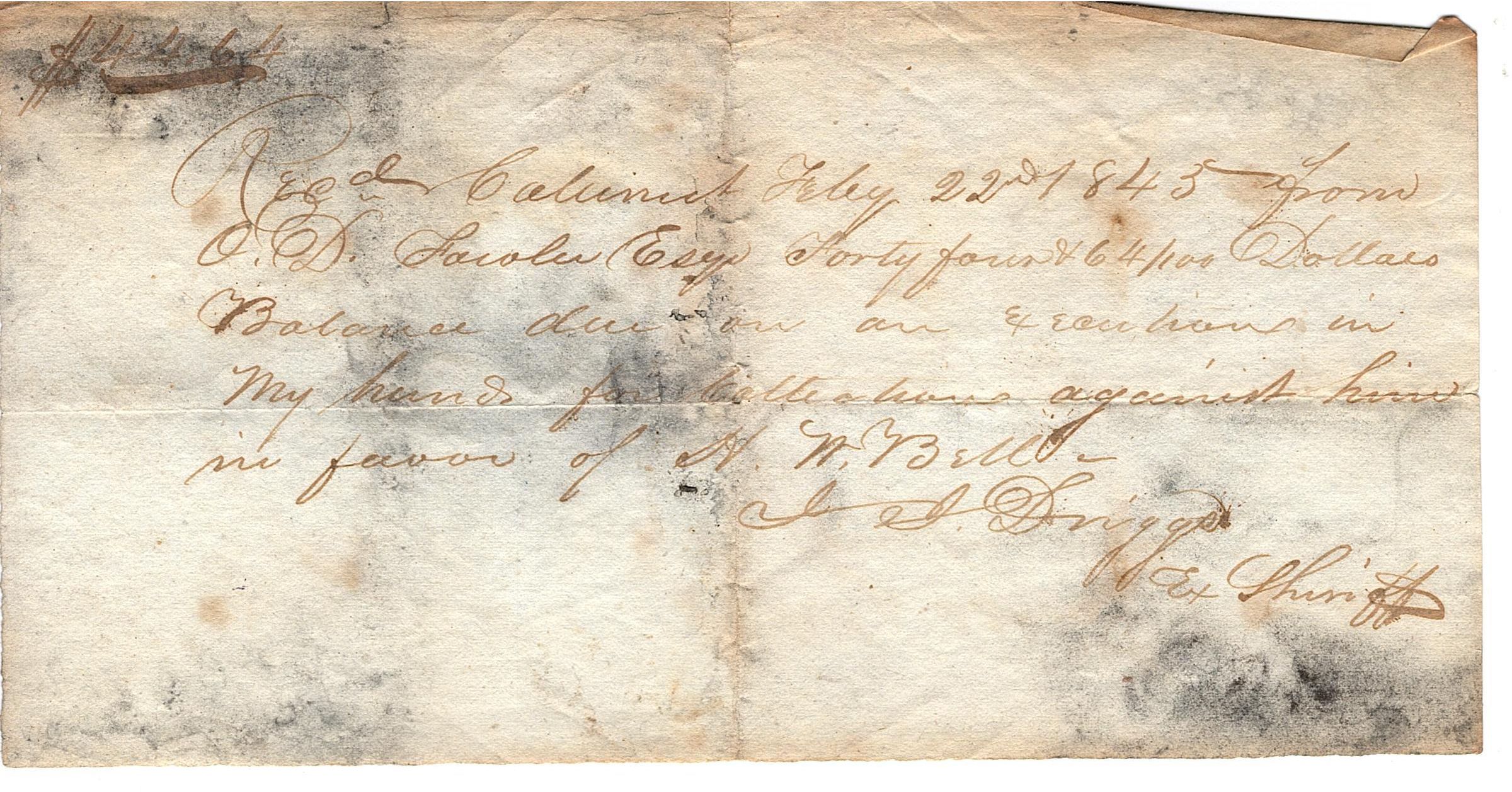 Small sheet of paper with writing in black ink that reads "$44.64, Rec'd Calumet Feby 22nd 1845 from O.D. Fowler Esq Forty four and 64/100 Dollars Balance due on an execution in my hands for -- a -- against him in favor of H.W. Bell" signed by I.I. Driggs, Ex Sheriff.Collection