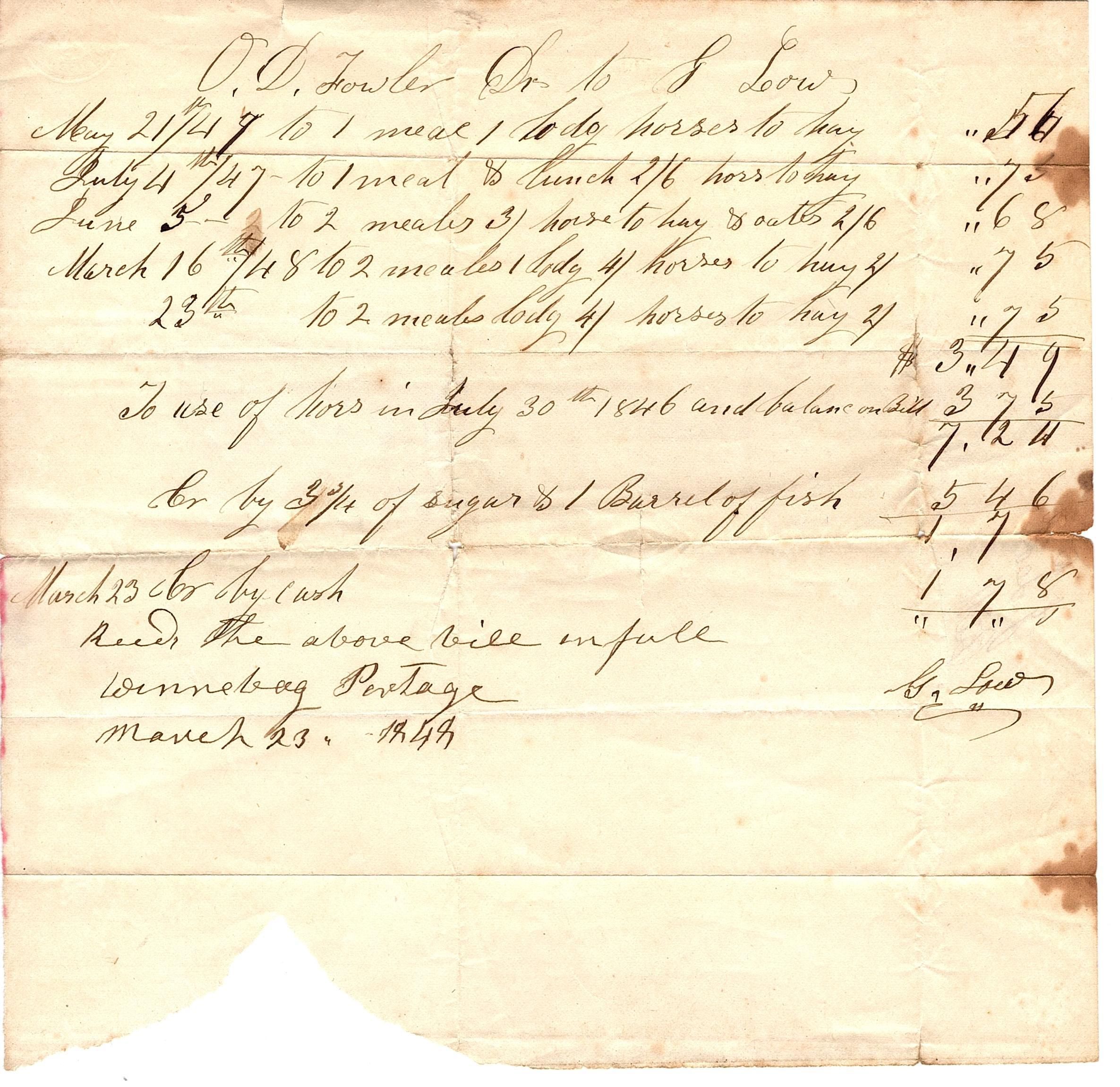 Half sheet of paper with a list of items purchased and prices in black ink. The list starts "O.D. Fowler Dr. to J. Low" and the list consists of farm items like horses to hay, but also includes sugar and fish. The back cover page reads "J. Low Bill"Collection