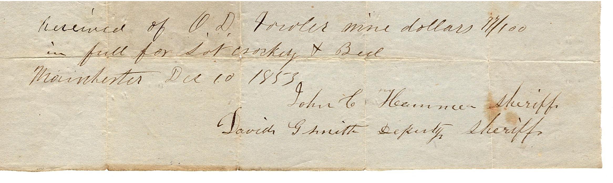 Partial piece of blue paper with writing in black ink that reads "Received of O.D. Fowler nine dollars 77/100 in full for sot crockery and bed. Manchester Dec 10 1853, John C. Heammea, Sheriff, David Ghnitt, Deputy Sheriff."Collection
