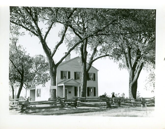 Black and white photograph of a two story house with an awning over the front door. There are three large trees in front of the house. A sign on the first tree on the left reads "Parking" with an arrow pointing right. There is a log fence in the front.