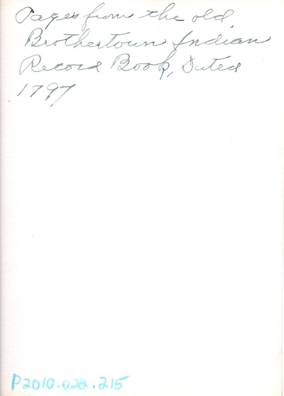 Written in black ink on BC2010.022.215A "Pages from the old Brothertown Indian Record Book, dated 1797". And written in black ink on BC2010.022.215B "The old Indian Record Book, 1937".Collection