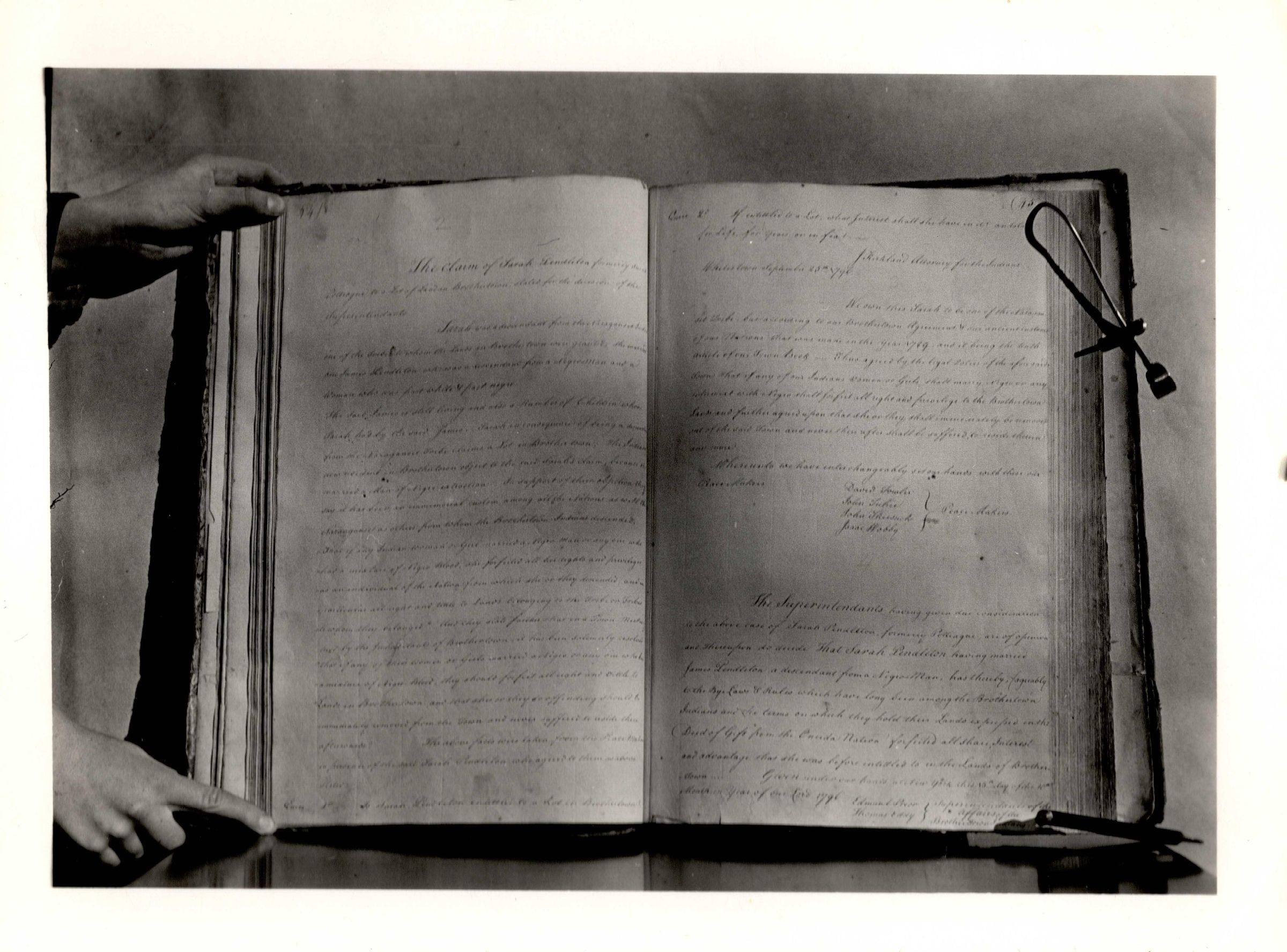 Two identical black and white photographs of a person holding a book open by the two left corners. There is a book mark on the right to help hold the page open. The left page starts "The Claim of Sarah Pendleton..."