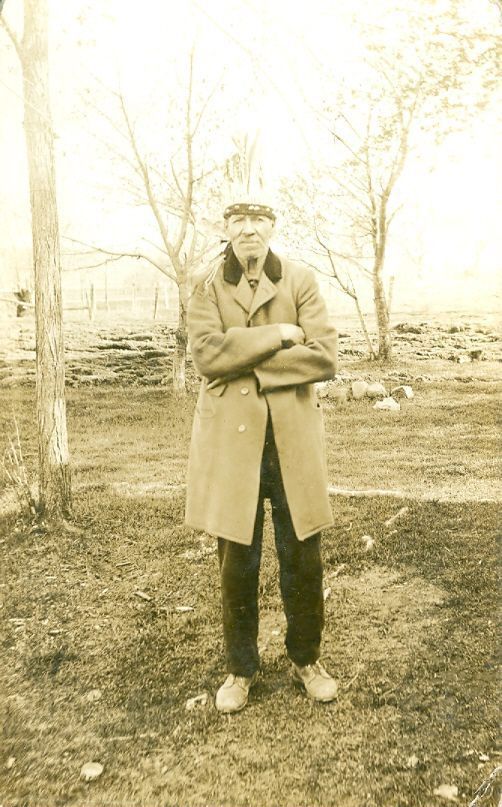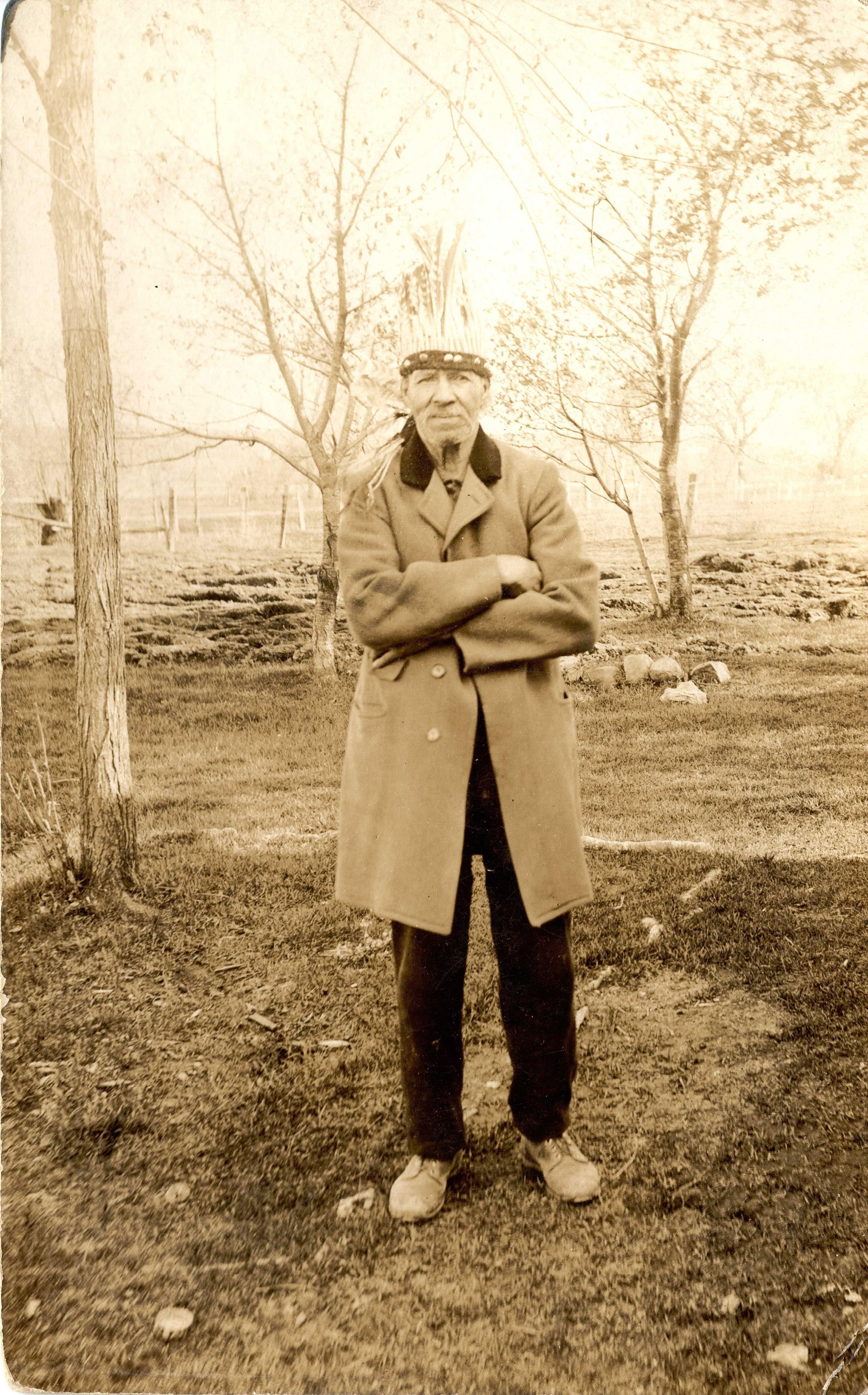 Black and white postcard of a older male wearing a wool jacket with arms crossed in front of his chest. He is also wearing a headdress. He is standing outside in a clearing with three trees around him and more in the distance.Collection