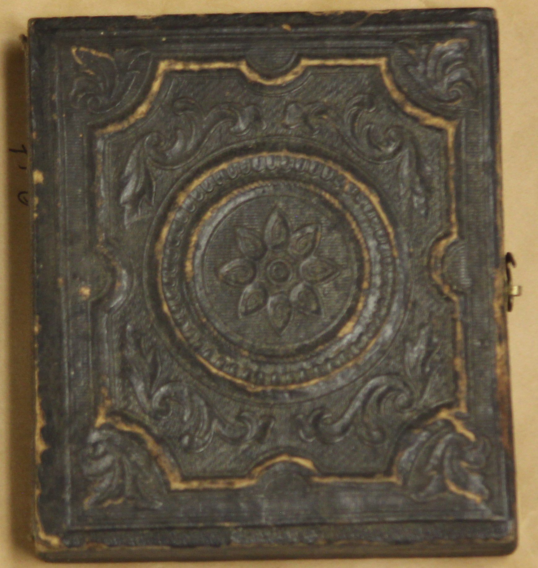 Tintype of a man standing next to a curtain (to his right, left in image). His hand is clasping his lapel near his shoulder. H e has a mustache and it looks as if the tintype was colored around his cheeks which look rosy. The tintype is framed with a cold decorative metal and "From Kansas" over the metal. The tintype is in a wood, latched book and there is a piece of red velvet with decorations opposite the image. The book has a floral design in the center bordered by a circle, branch looking flourishes, and finally a lined border. The front and back covers have the same design. The book came in an envelope with "Orlando D. Dick, #44" written on it. This is most likely O.E. Heller's organization system.