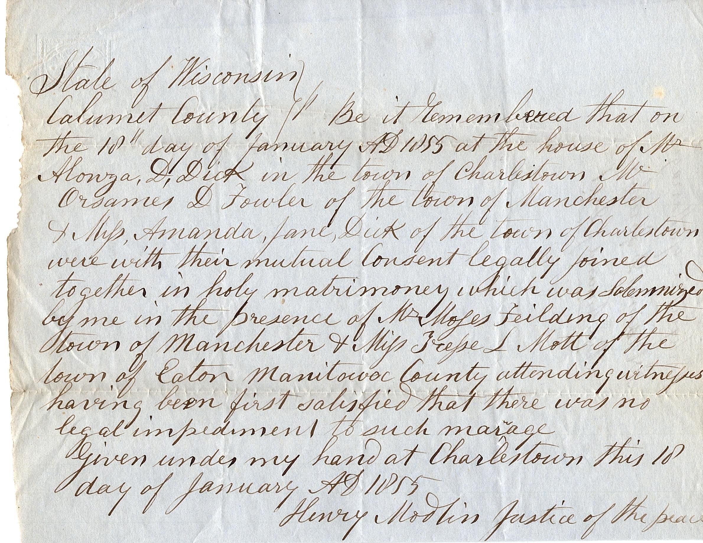 Half sheet of blue paper that acts of the Certificate of Marriage for Mr. Orsames D. Fowler and Miss Amanda J. Dick. It is a handwritten account of the marriage at Mr. Alonza D. Dick's house in the town of Charleston, signed January 18, 1855 by Henry Modlin, Justice of the Peace.Collection