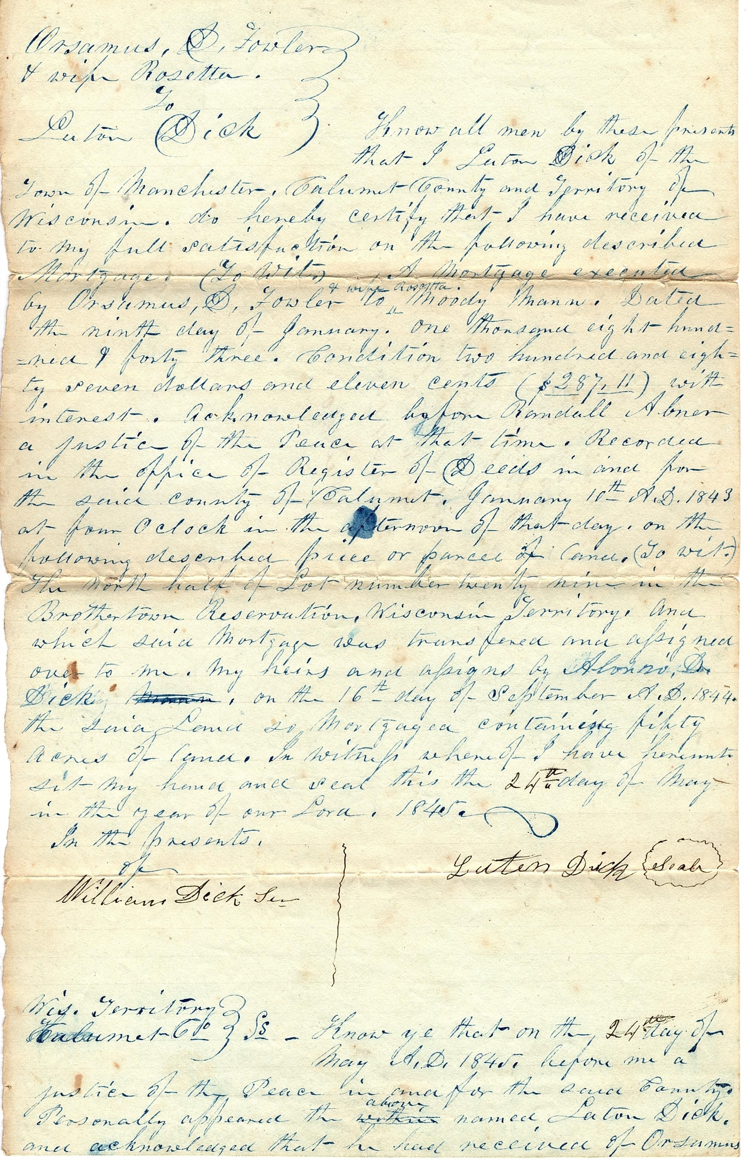 Official document-discharge of mortgage. "I hereby certify that I received the within discharge for record on the ninth day of July A.D. 1845". The mortgage was between Orsamus D. Fowler and wife Rosetta to Laton Dick as it states in the top left corner of the document. The document is written in blue ink with two signatures in black ink at the bottom (William Dick Sr. and Laton Dick).Collection