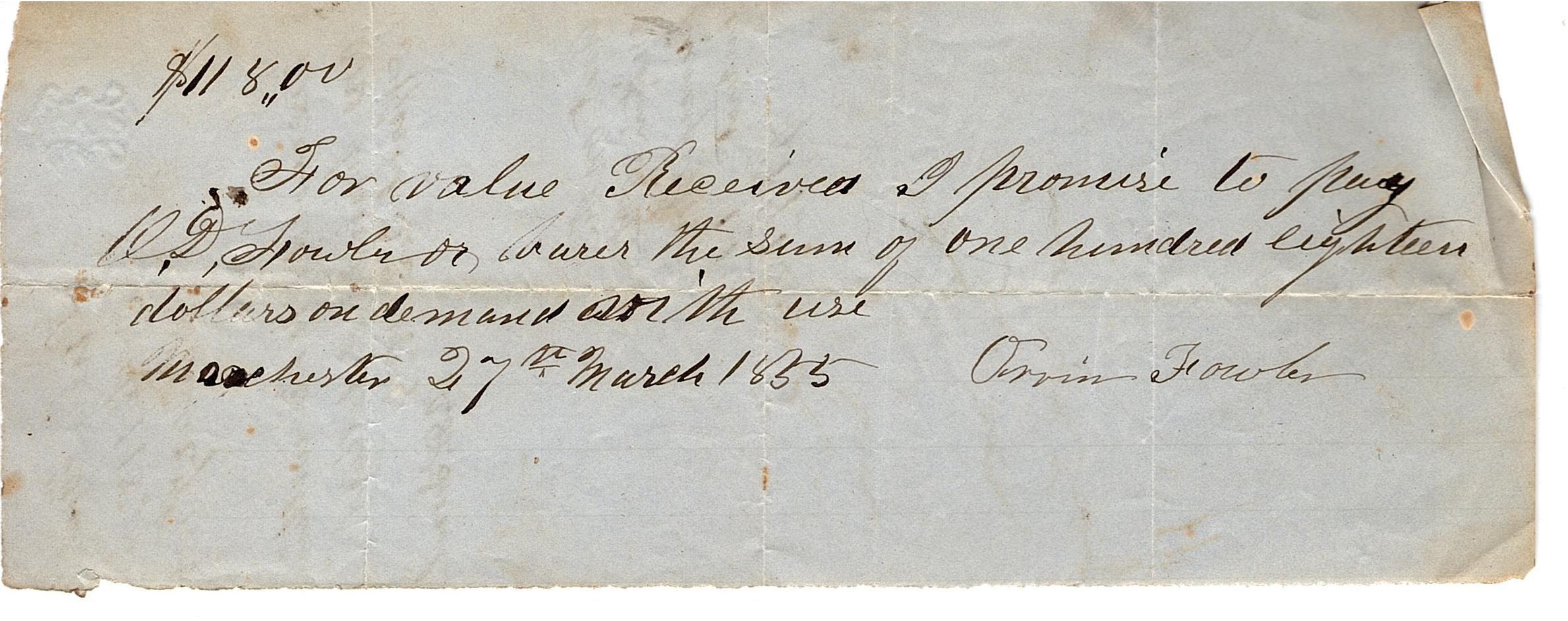 Partial piece of blue paper with writing in black ink that reads "$118,00or value Received I promise to pay O.D. Fowler or bearer the sum of one hundred eighteen dollars on demand with use. Manchester 27th March 1855" and signed by Orvin Fowler. The back also has writing in black ink that reads "Orvin Fowler, Note 118,00, March 27 1855, Received on the within one hundred dollars, April 23 1855, O.D. Fowler" and in a different ink in the middle of the back it mentions interest paid and calculates it.Collection