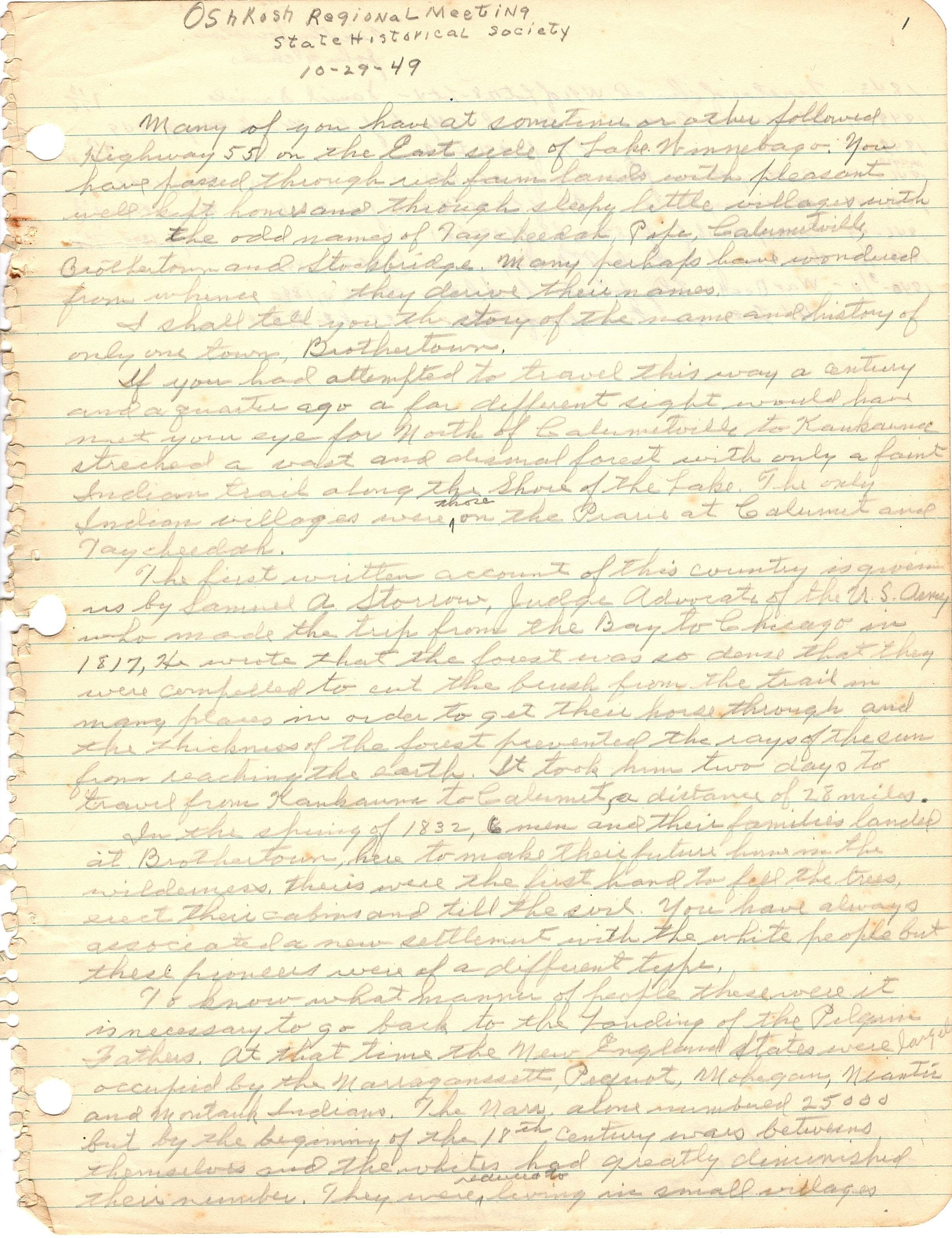 9 sheets of paper with 18 pages of hand written notes, mostly in pencil, titled "Oshkosh Regional Meeting, State Historical Society, 10-29-49". It starts "Many of you have at sometime or other followed Highway 55 on the East side of Lake Winnebago..." It appears to be a similar speech as many in this collection that goes through the history of the Brothertown. It appears as if the notes are actually on the front of each page and the notes on the back of a few pages in black ink are notes for something else, but are similar notes pertaining to Brothertown history as scattered through this collection.Collection