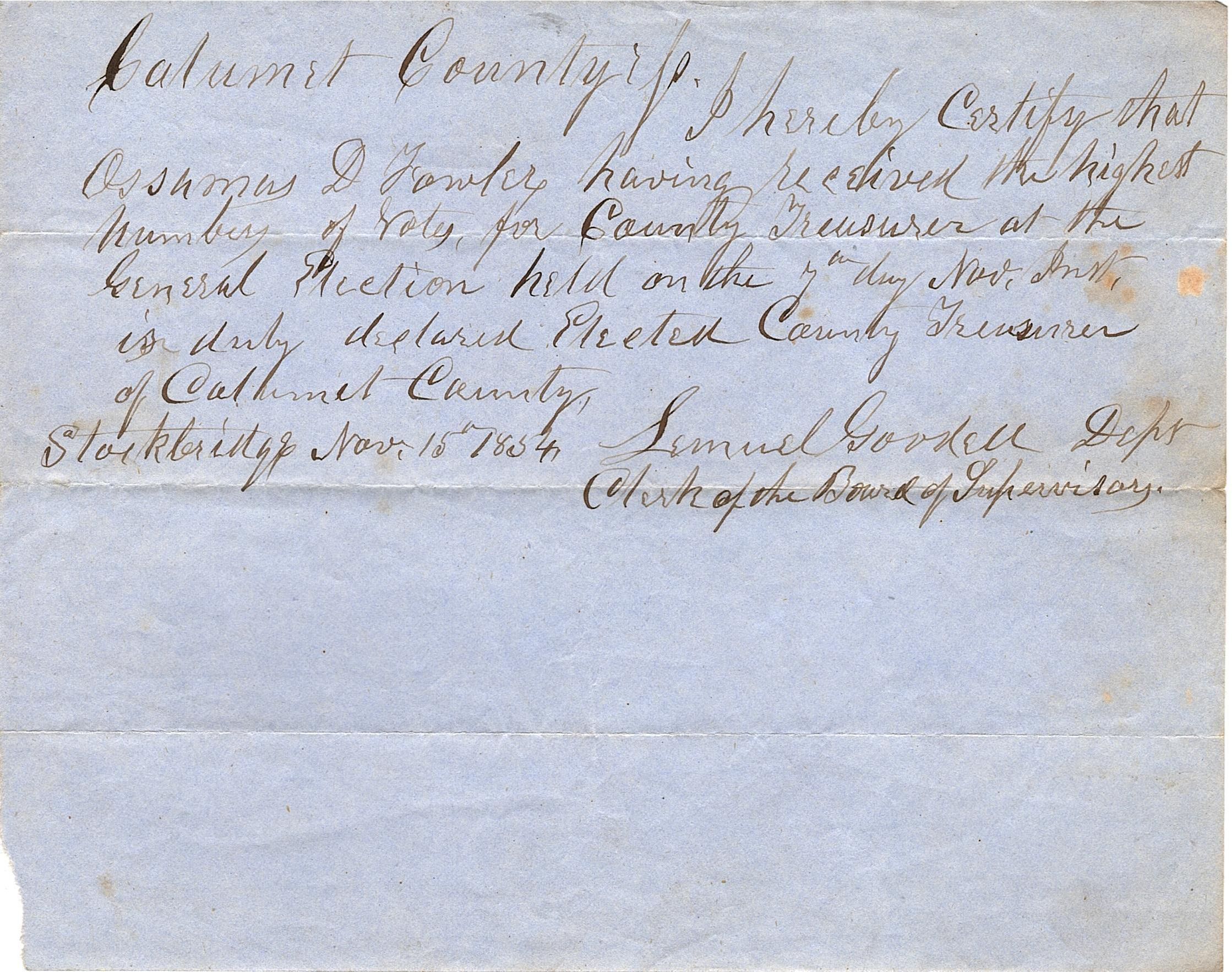 Half sheet of blue paper with writing in black ink. It reads "Calumet County, I hereby certify that Ossamus [sic] D. Fowler having received the highest number of votes for County Treasurer at the General Election held on the 7th day Nov, -- is duly declared Elected County Treasurer of Calumet County, Stockbridge Nov. 15, 1854. Samuel Goodell, Dept, Clerk of the Board of Supervisors."Collection