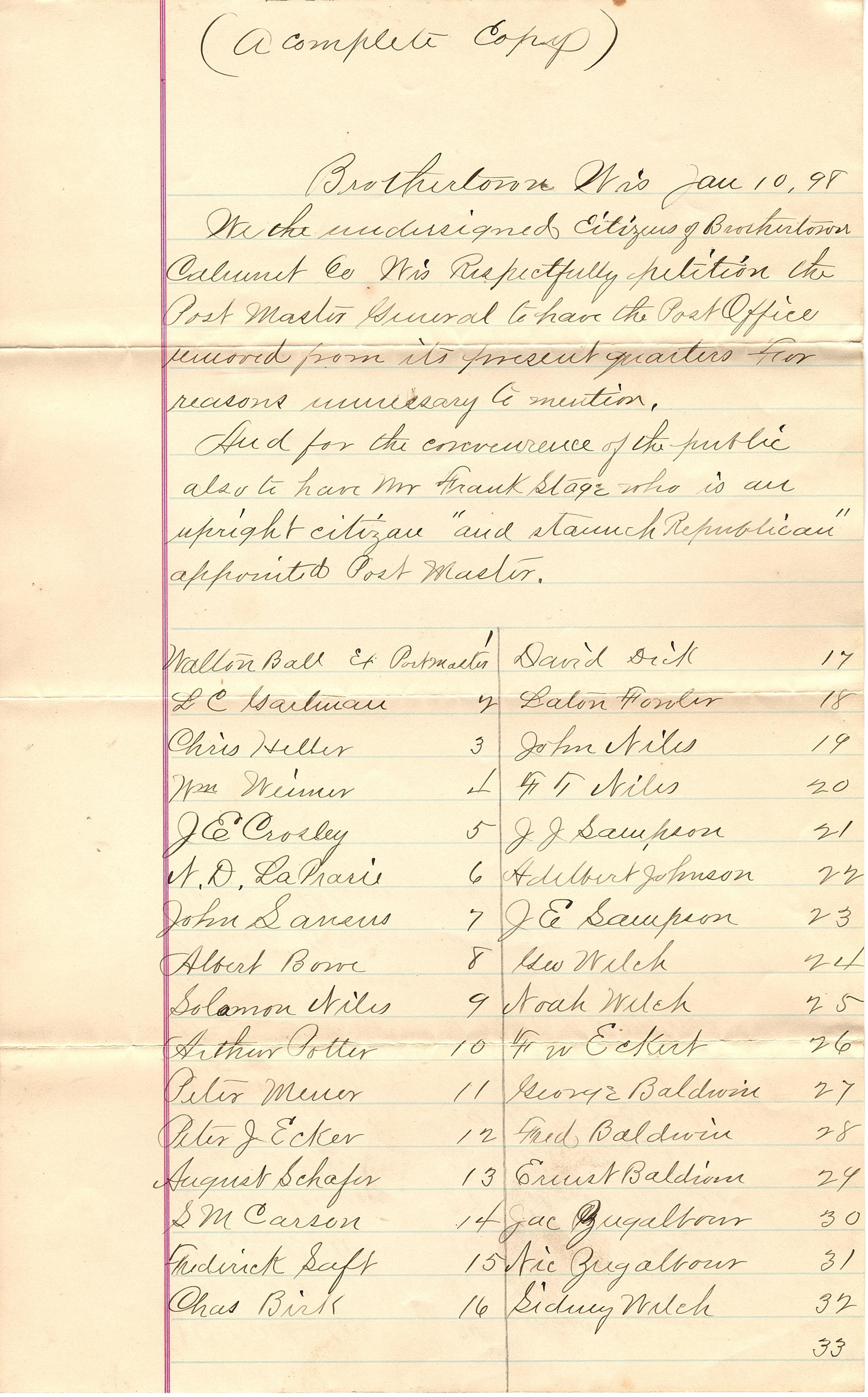 Two sheets of lined, legal sized paper with a list of names. At the top of the first page is "(a complete copy) Brothertown Wis Jan 10, 98. We the undersigned citizens of Brothertown Calumet Co Wis Respectfully petition the Post Master Guard to have the Post Office removed from its present quarters for reasons unnecessary to mention." It then asks for Frank Stage "an upright citizen 'and staunch republican' appointed Post Master." Then it is a list of 199 names over four pages on two sheets of paper.Collection