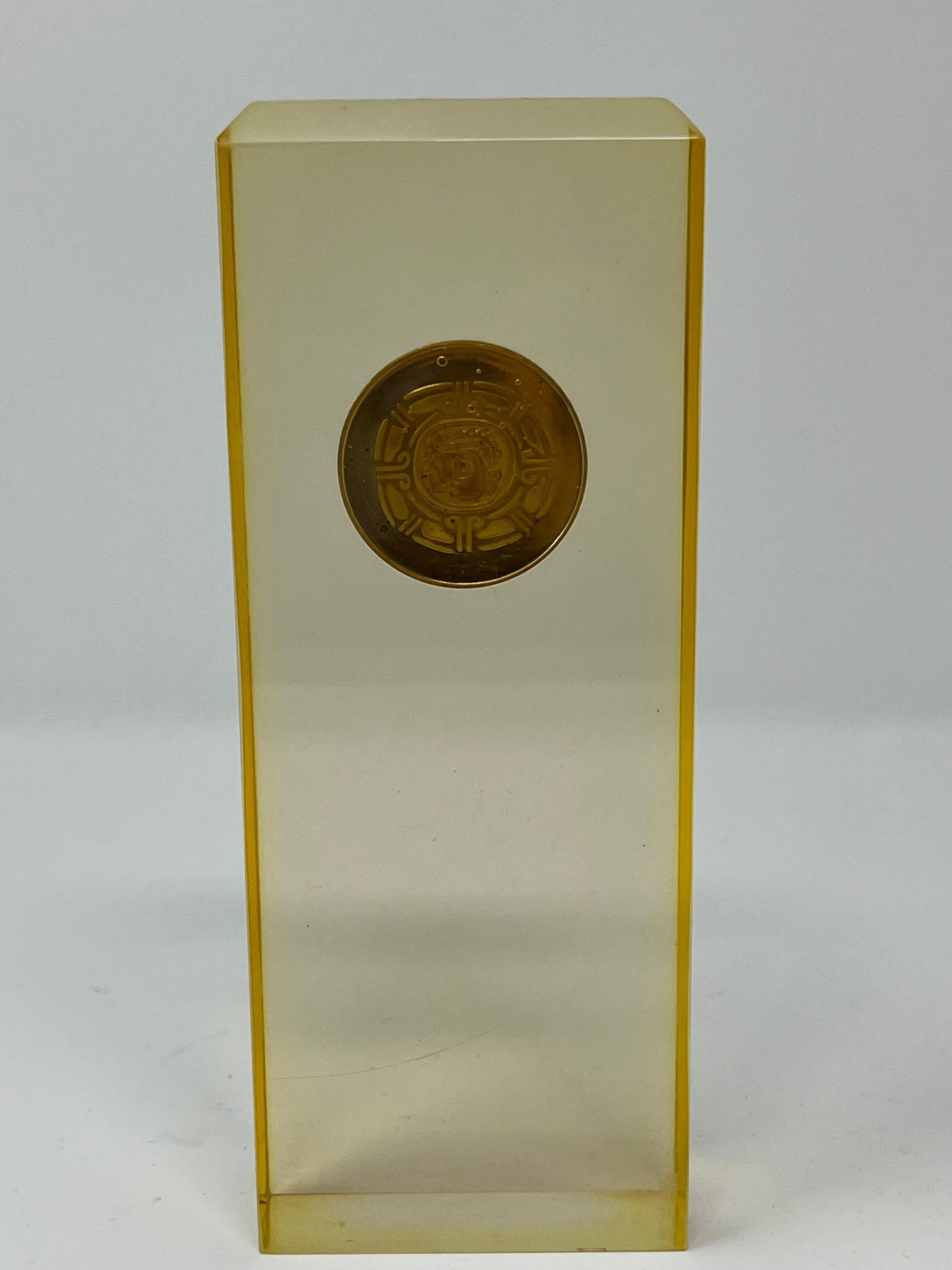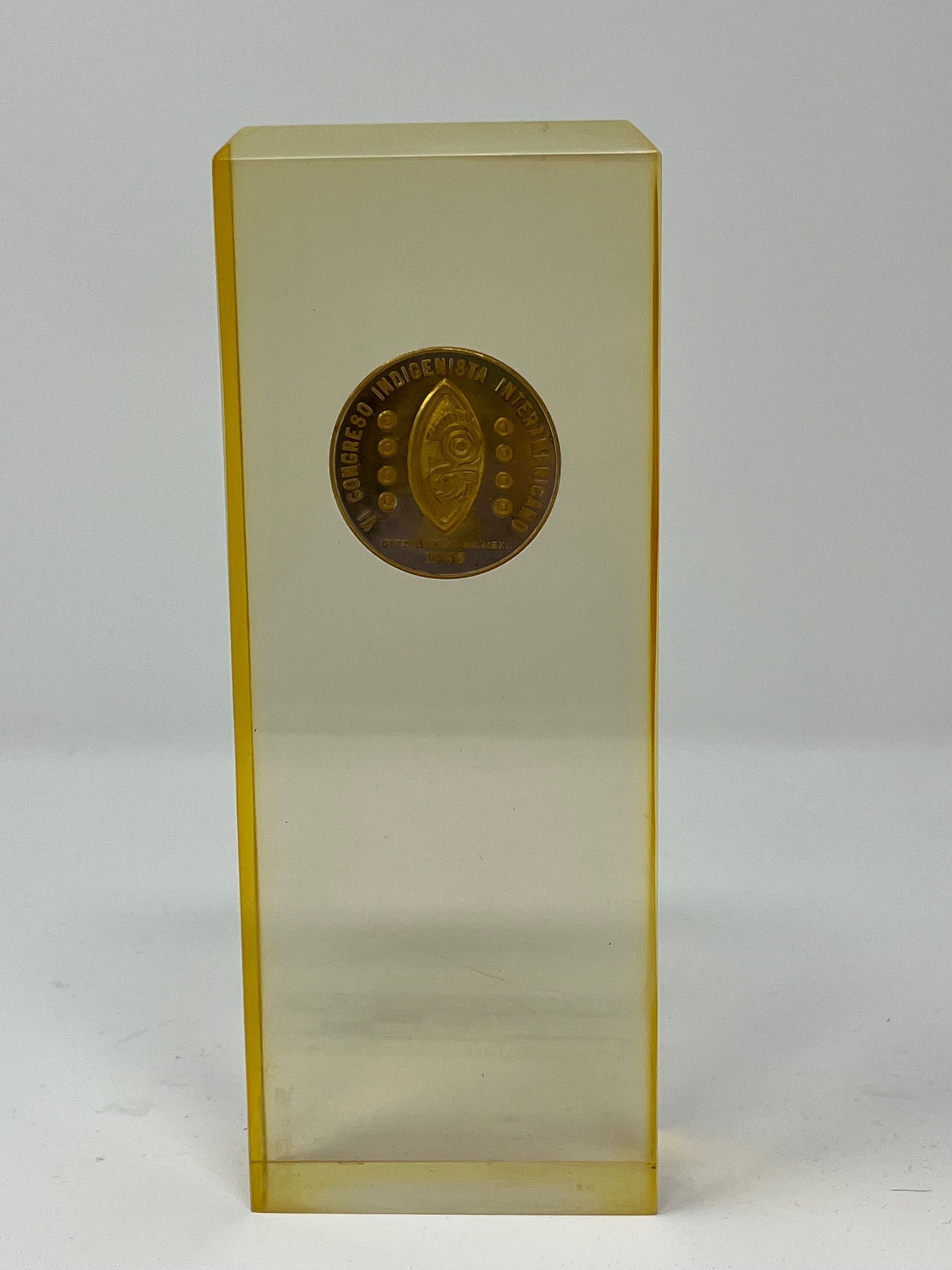 Plaque: clear rectangular plaque with single bronze coin set inside. The coin reads "-- Congreso Indigenista Interamericano" and the back has a design on it. It is originally inventoried as a 1968 Mexican coin.Collection