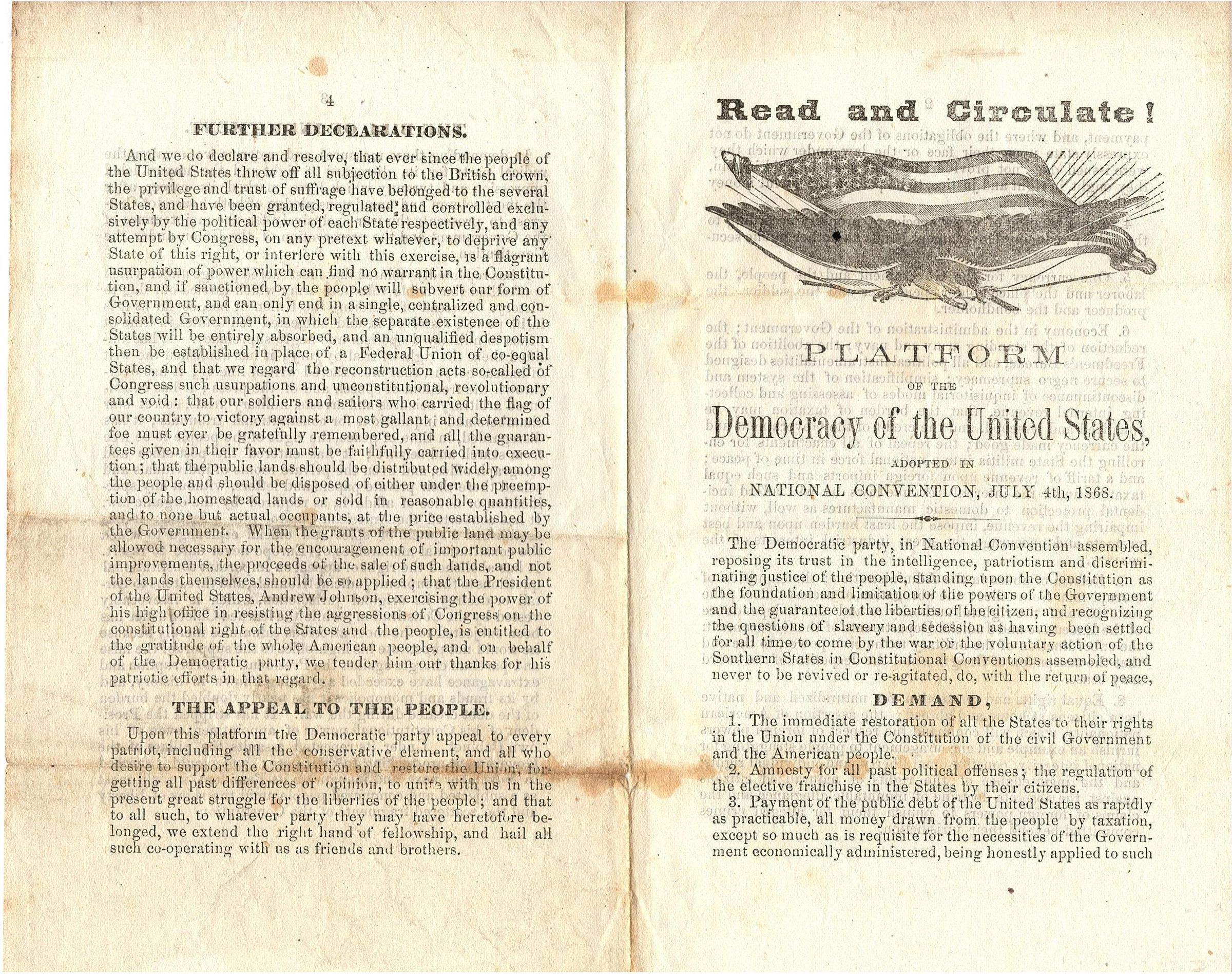 Single sheet of paper, folded in half with print in black ink creating four pages of information. It has a large drawing of an eagle with its wings spread wide in front of a flowing American flag. Above the drawing is "Read and Circulate!" and below it it reads "Platform of the Democracy of the United States, adopted in National Convention, July 4th 1868". The flyer is split into sections: Demand, The Bill of Indictment, Further Declarations, and The Appeal to the People.Collection