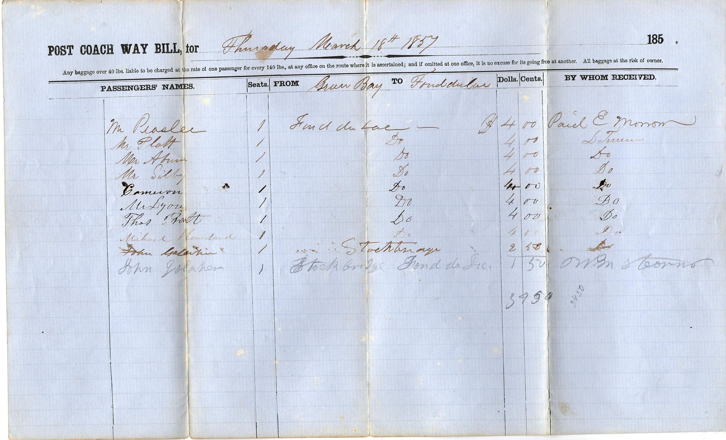 Single sheet of blue legal sized paper with a Waybill form filled out in black ink. The form starts "Post Coach Way Bill, for Thursday March 18th 1857". There are six columns to be filled in: Passengers' Names, Seats, From and To, Dolls, Cents, By whom received". This bill has ten entries in black ink and the last one is in pencil. There is nothing written on the back.Collection