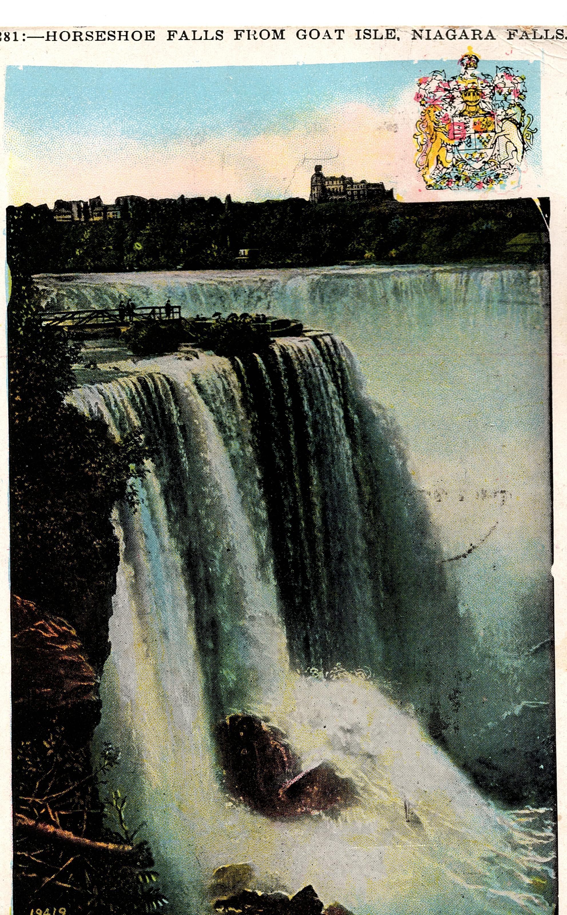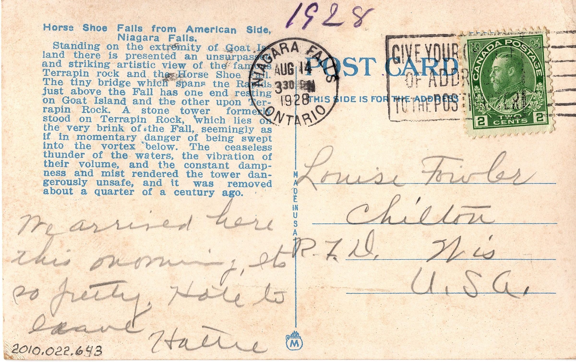Postcard "281: Horseshoe Falls from Goat Isle, Niagara Falls". It is a colored drawing of Niagara Falls with a large building in the background. In goldish ink on the bottom is the number "19419". Addressed to Louise Fowler or Chilton, Wis. The back has blue print that reads "Horse Shoe Falls from American side, Niagara Falls..." The hand written note in pencil reads "We arrived here this morning. It's so pretty. Hate to leave. Hattie". It has a Canadian postage stamp and Niagara Falls, Ontario Aug. 14, 1928Collection
