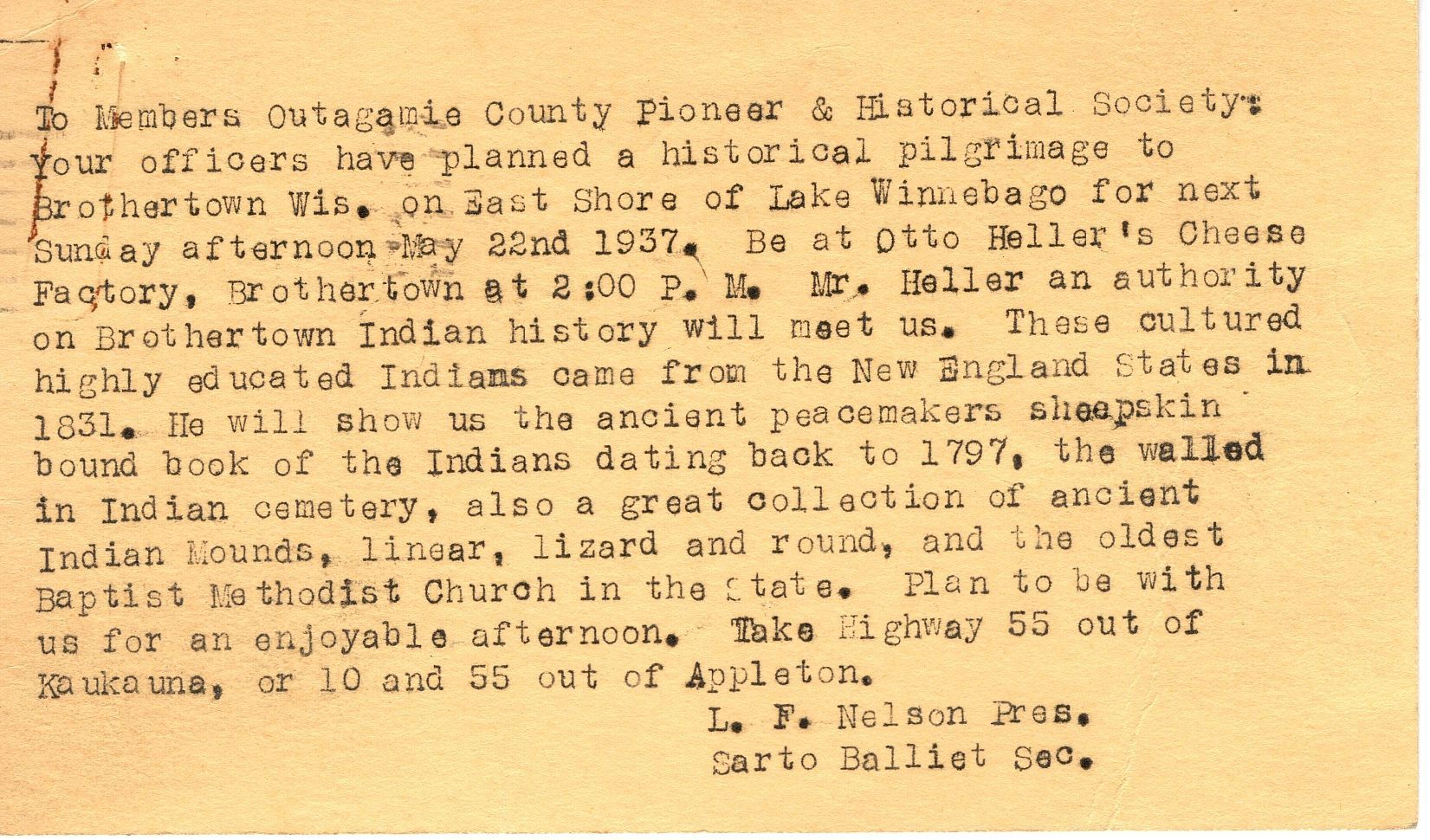 Postcard to Otto Heller, RR 3, Chilton, Wis. The message is typed on the card and reads "To members Outagamie County Pioneer & Historical Society. Your officers have planned a historical pilgrimage to Brothertown Wis. on East Shore of Lake Winnebago for next Sunday afternoon May 22nd 1937. Be at Otto Heller's Cheese Factory, Brothertown at 2:00 P.M. Mr. Heller an authority on Brothertown Indian history will meet us. These cultured highly educated Indians came from the New England States in 1831. He will show us the ancient peacemakers sheepskin bound book of the Indians dating back to 1797, the walled in cemetery, also a great collection of ancient Indian Mounds, linear, lizard and round, and the oldest Baptist Methodist Church in the State. Plan to be with us for an enjoyable afternoon. Take Highway 55 out of Kaukauna, or 10 and 55 out of Appleton. L.F. Nelson Pres. Sarto Balliert Sec."