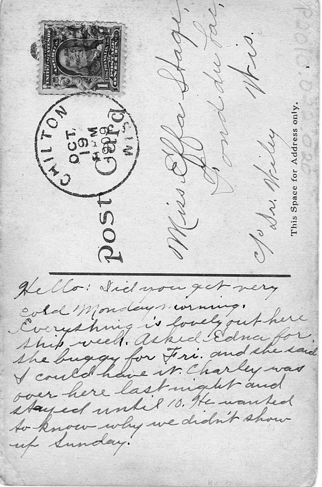 Written in black ink on the back addressed to "Miss Effa Stage, Fond du Lac, Wis. c/o Dr. Wiley". "Hello: Did you get very cold Monday morning. Everything is lovely out here this week. Asked Edna for she buggy for Fri. and she said I could have it. Charley was over here last night and stayed until 10. He wanted to know why we didn't show up Sunday." There is a Franklin 1 cent stamp and a post office stamped marked Chilton, Wis. Oct. 19 1909Collection
