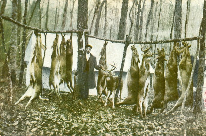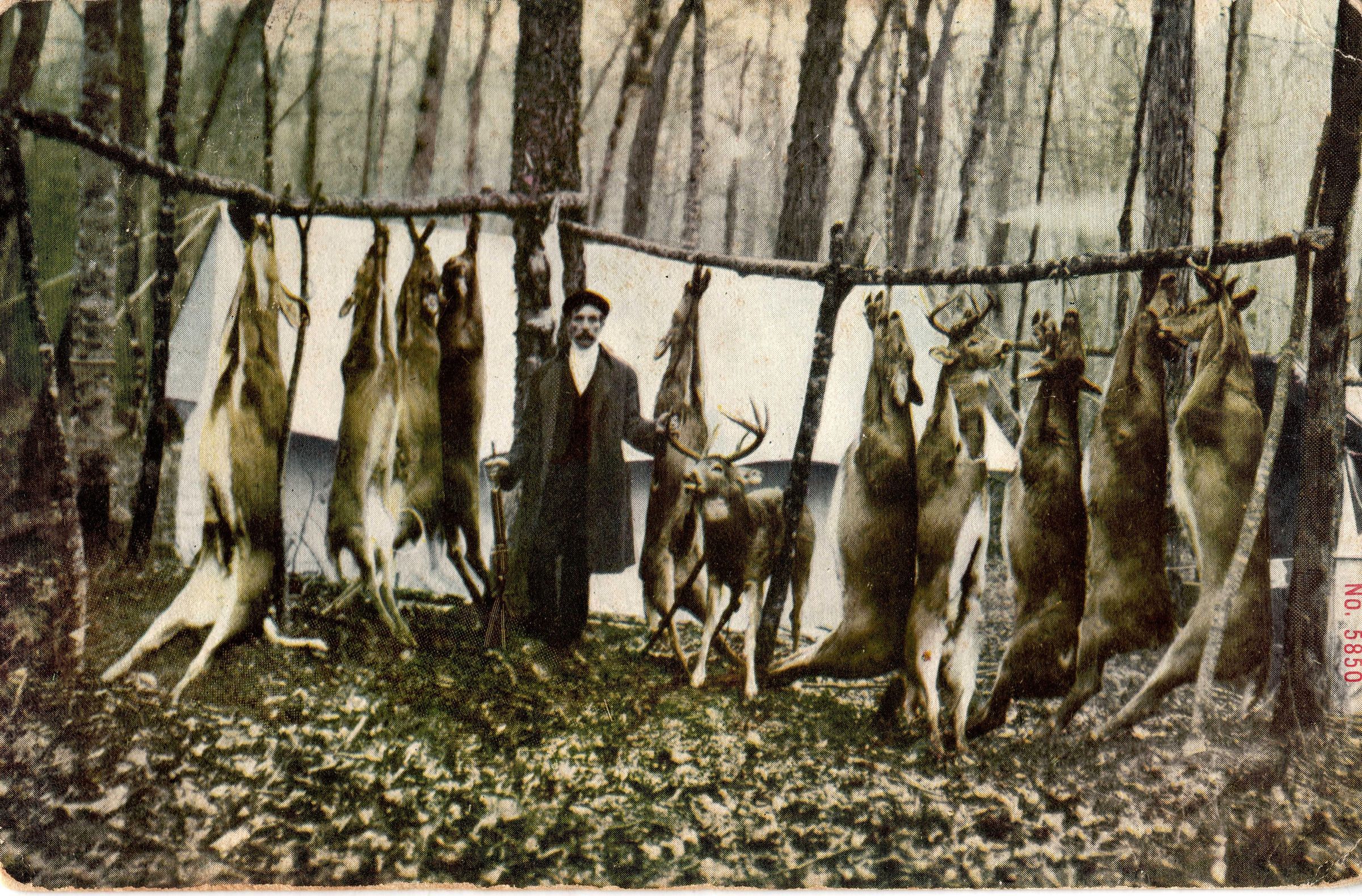 Colorized photo of a man with 11 dear carcasses, 10 hanging and one standing with the man holding its antlers. He is holding a rifle in his right hand. He wears a dark trench coat and dark suit underneath. There is a white tent or building behind him. Printed in red ink on the right side of the postcard is "No. 5850".