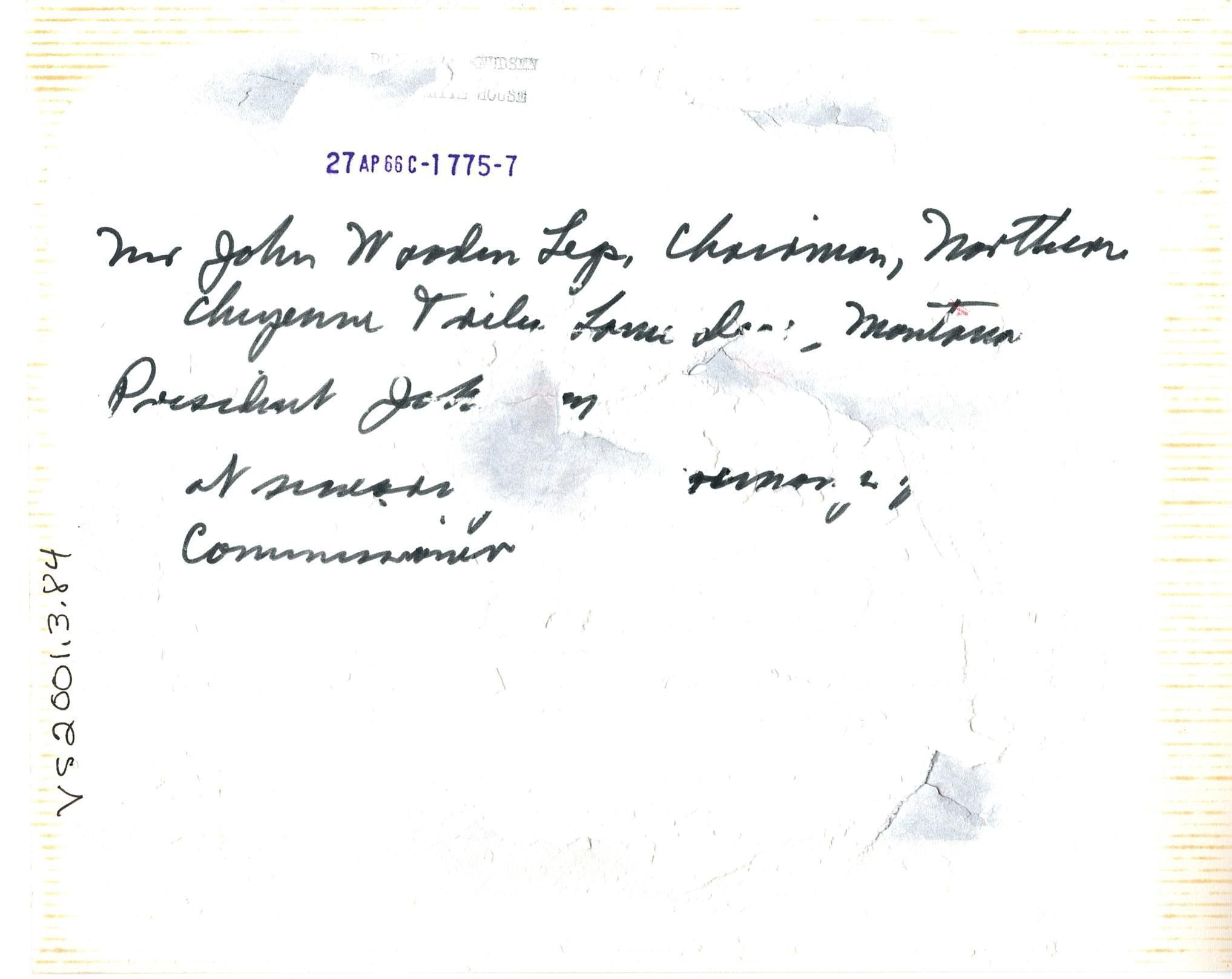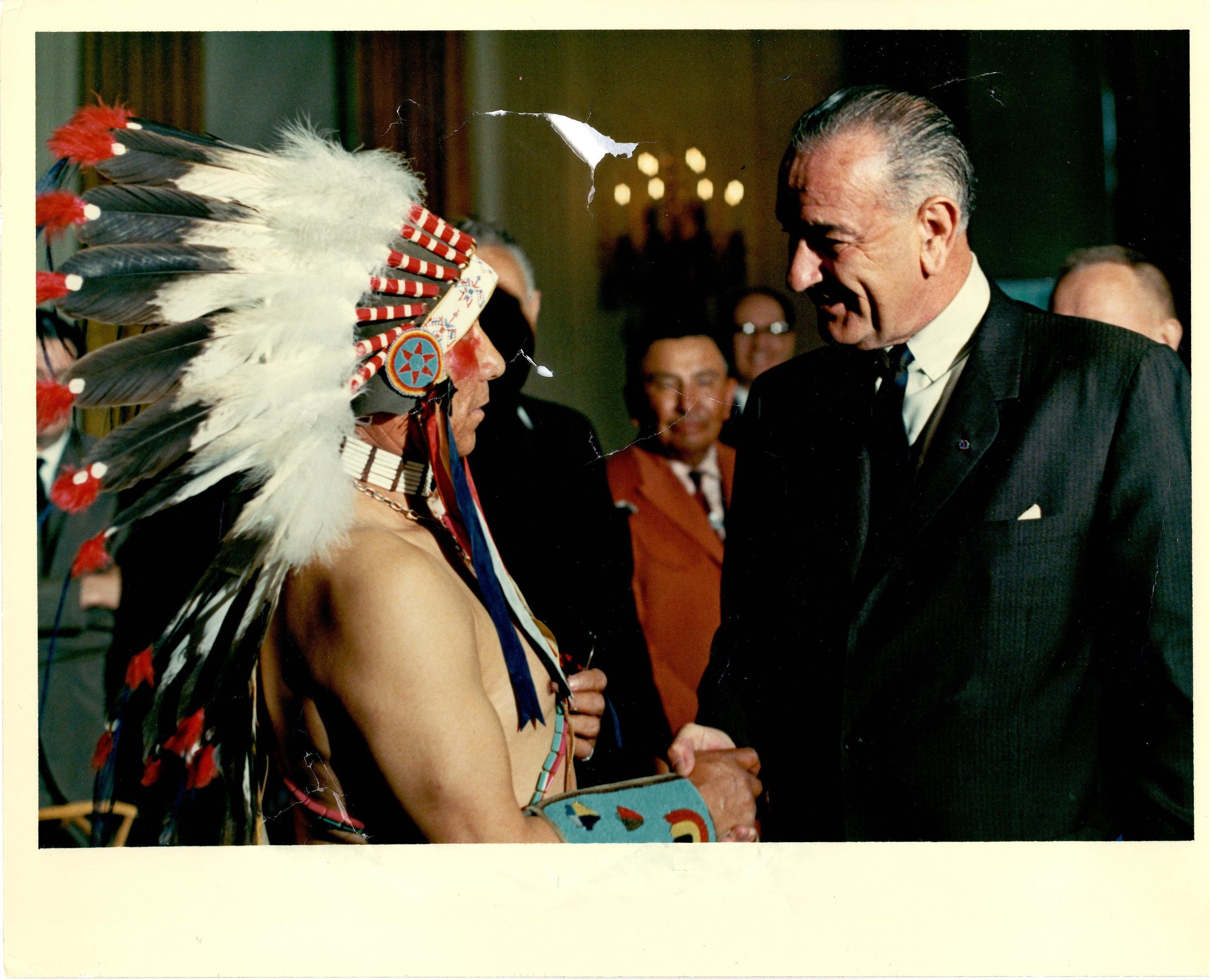 Colored photo of President Johnson shaking hands with a Native man wearing a headdress and red paint on his face. There are people in the background looking on. Written in black ink on the back "Mr John Worden Lep, Chairman, Northern Cheyenne Tribe of Indians, Montana. President Johnson -- at -- Commissioner."Collection