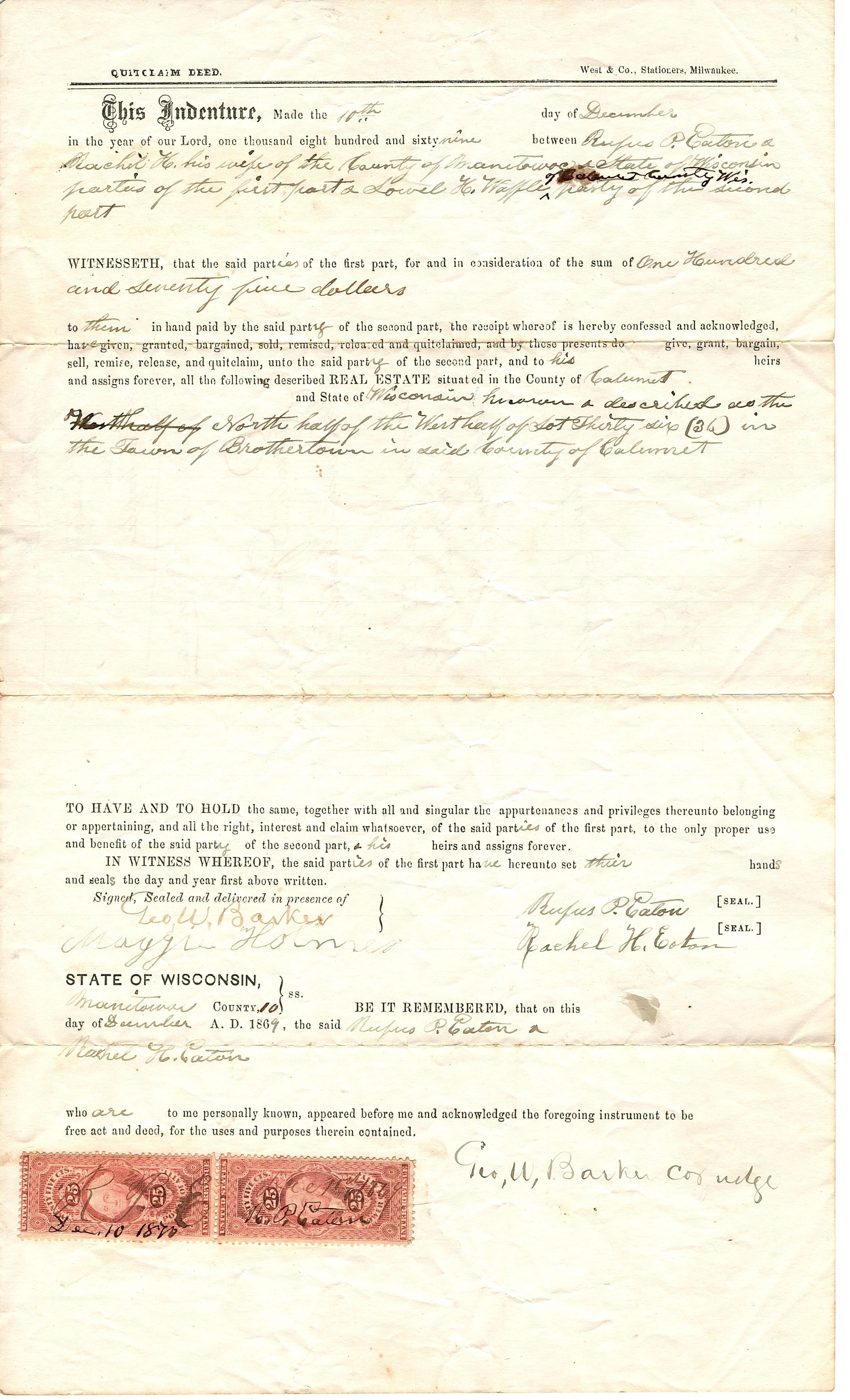 Official document-quit claim deed. R.P. Eaton to L.H. Waffle. Recorded June 23rd, 1878. Single sheet of legal sized paper printed by West & Co., Stationers, Milwaukee and filled in with black ink. It was made on December 10, 1869 between Rufus P. Eaton and wife (Rachel) and Lowell H. Waffle. There are two twenty-five cent stamps at the bottom.Collection