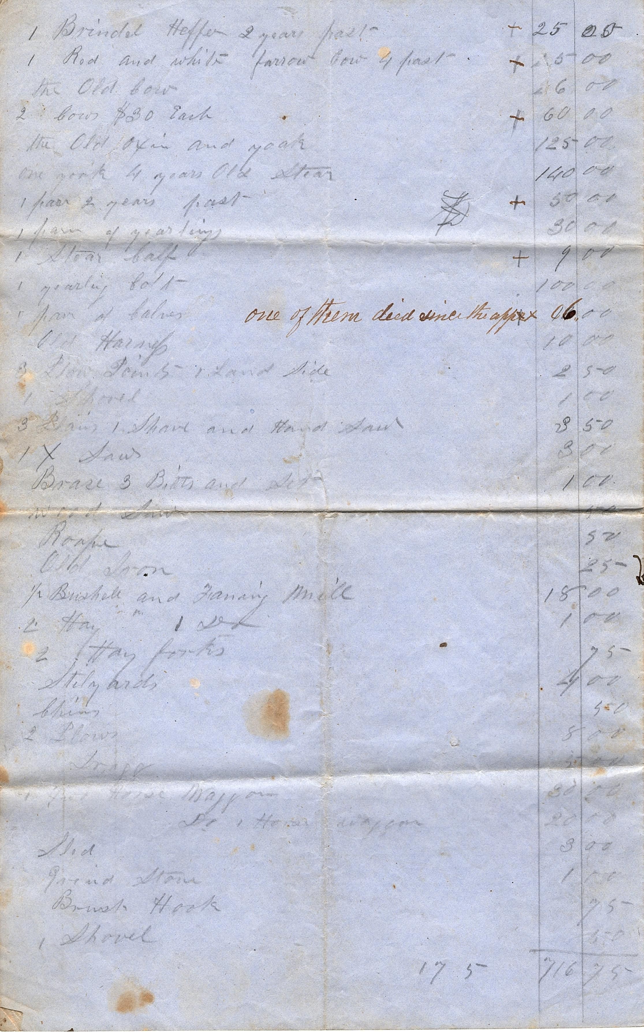 Legal sized sheet of blue paper with four pages (single sheet folded to create two pages, four if counting back and front). On the inside of the paper on a cover page it reads "Randel Abner or Isaac Dick Inventory 1847" written in blue ink. The front and back pages are a list of items and costs written in pencil starting with "1 Brindel Heffer 2 years past" and ends with "3 1/2 Hives of Bees at 24/-". Written in a black ink on the first page next to "pair of calves" it reads "one of them died since the appt". At the bottom of the back page written in black ink are totals being added or subtractedCollection