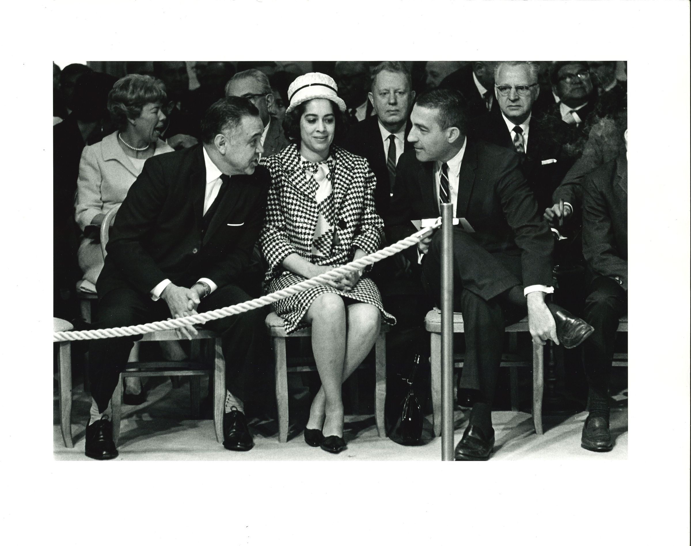Black and white photograph of Robert Bennett sitting next to Cleota Bennett and leaning over her to talk to another man. They are in a crowd behind a rope.