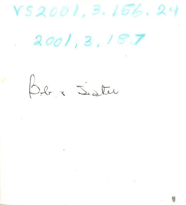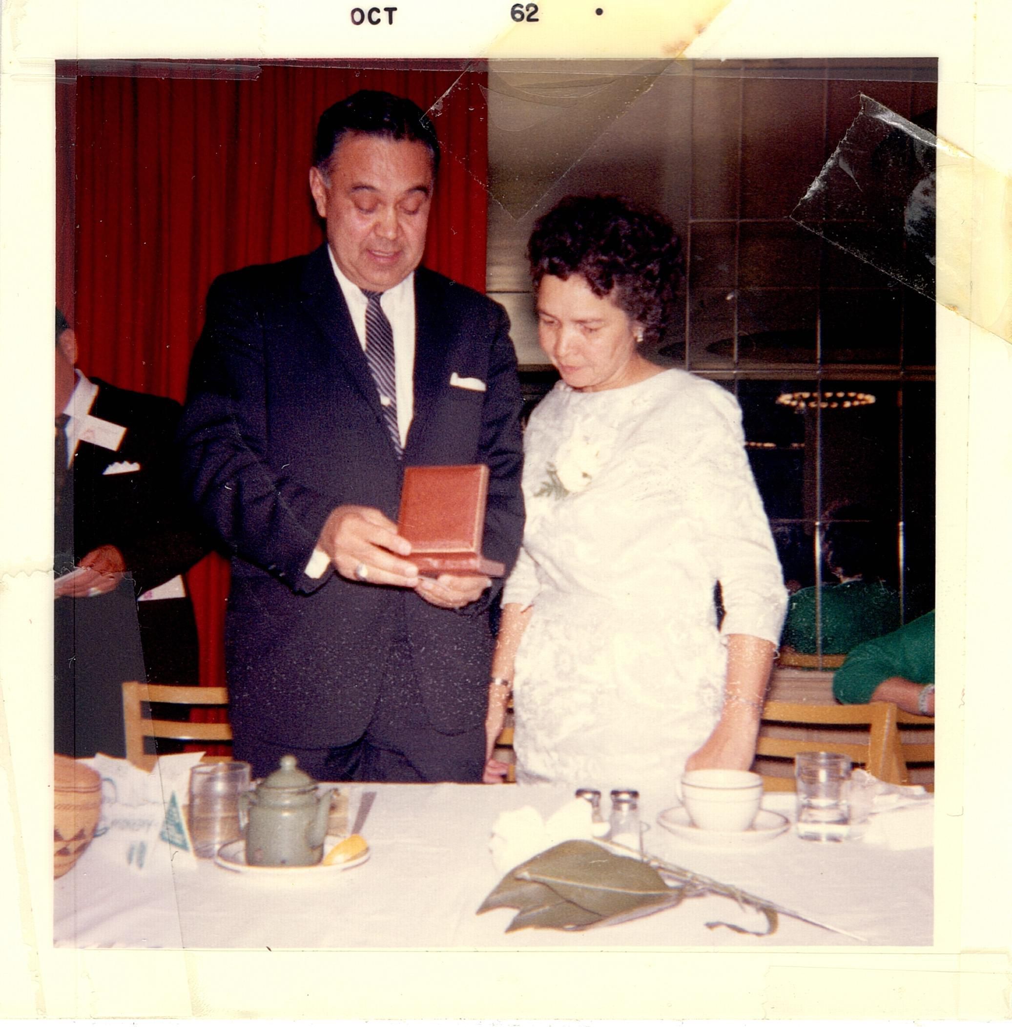 Colored photograph of Robert Bennett and sister, Prudence Bennett Doxtator, looking at a commemorative box, unsure what's in the box.Photograph Details