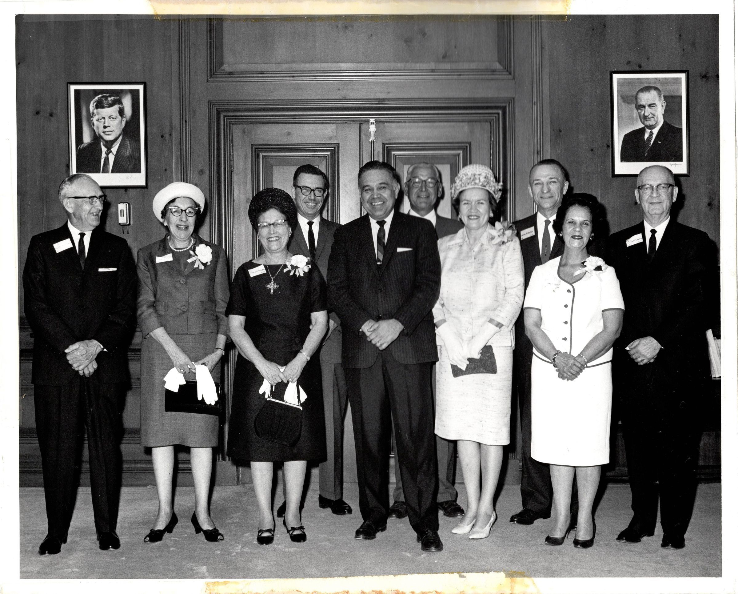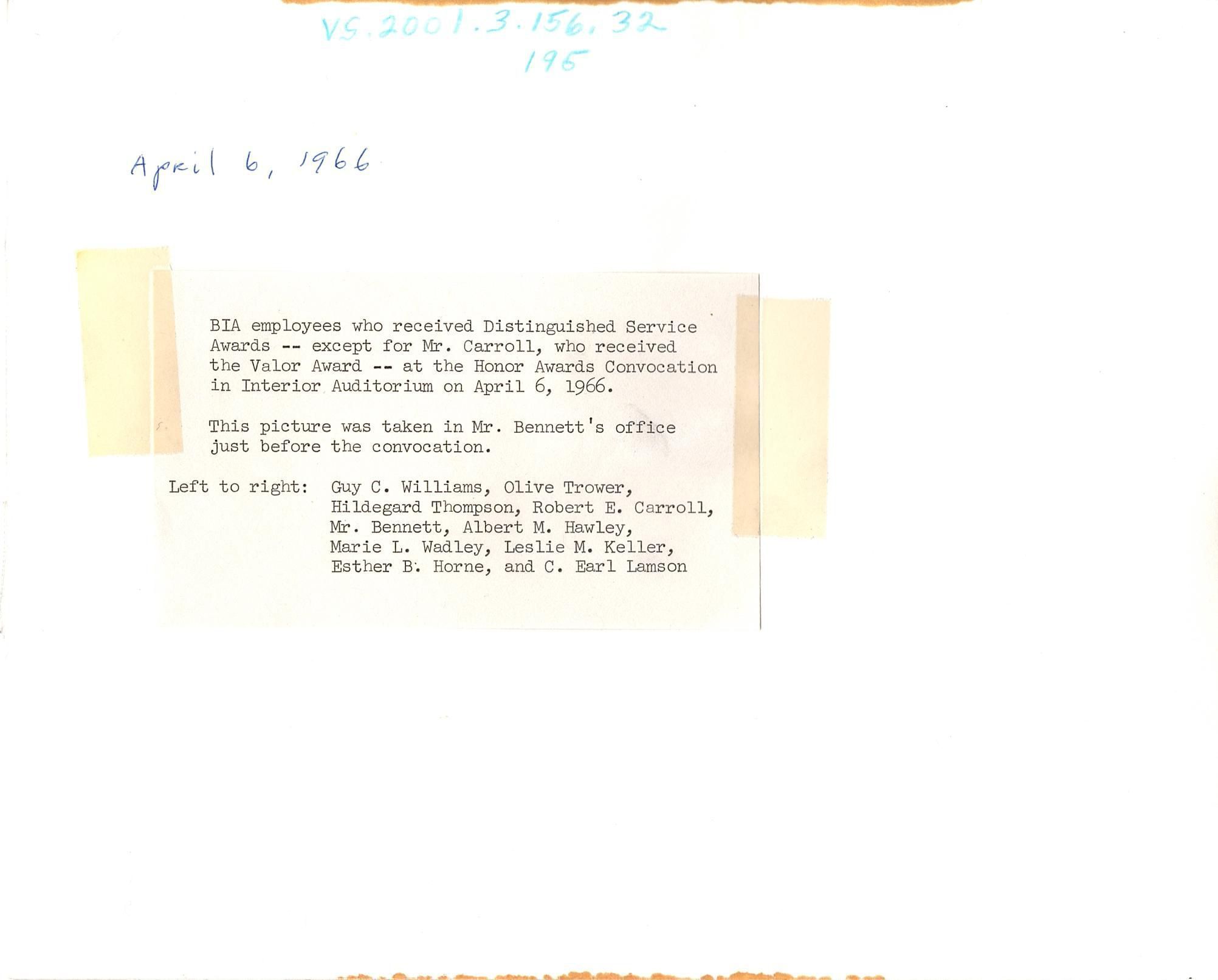 Black and white photograph of a group of individuals in a government building with framed photos of John F. Kennedy and Richard Nixon behind them. There are 10 people, 4 (four) woman (two on either side of Bennett) and 6 (six) men. Back of photo reads "BIA employees who received Distinguished Service Awards--except for Mr. Carroll, who received the Valor Award--at the Honor Awards Convocation in Interior Auditorium on April 6, 1966. This Picture was taken in Mr. Bennett's office just before the convocation. Left to right: Guy C. Williams, Olive Trower, Hildegard Thompson, Robert E. Carroll, Mr. Bennett, Albert M. Hawley, Marie L. Wadley, Leslie M. Keller, Esther B. Horne, and C. Earl Lamson."Photograph Details