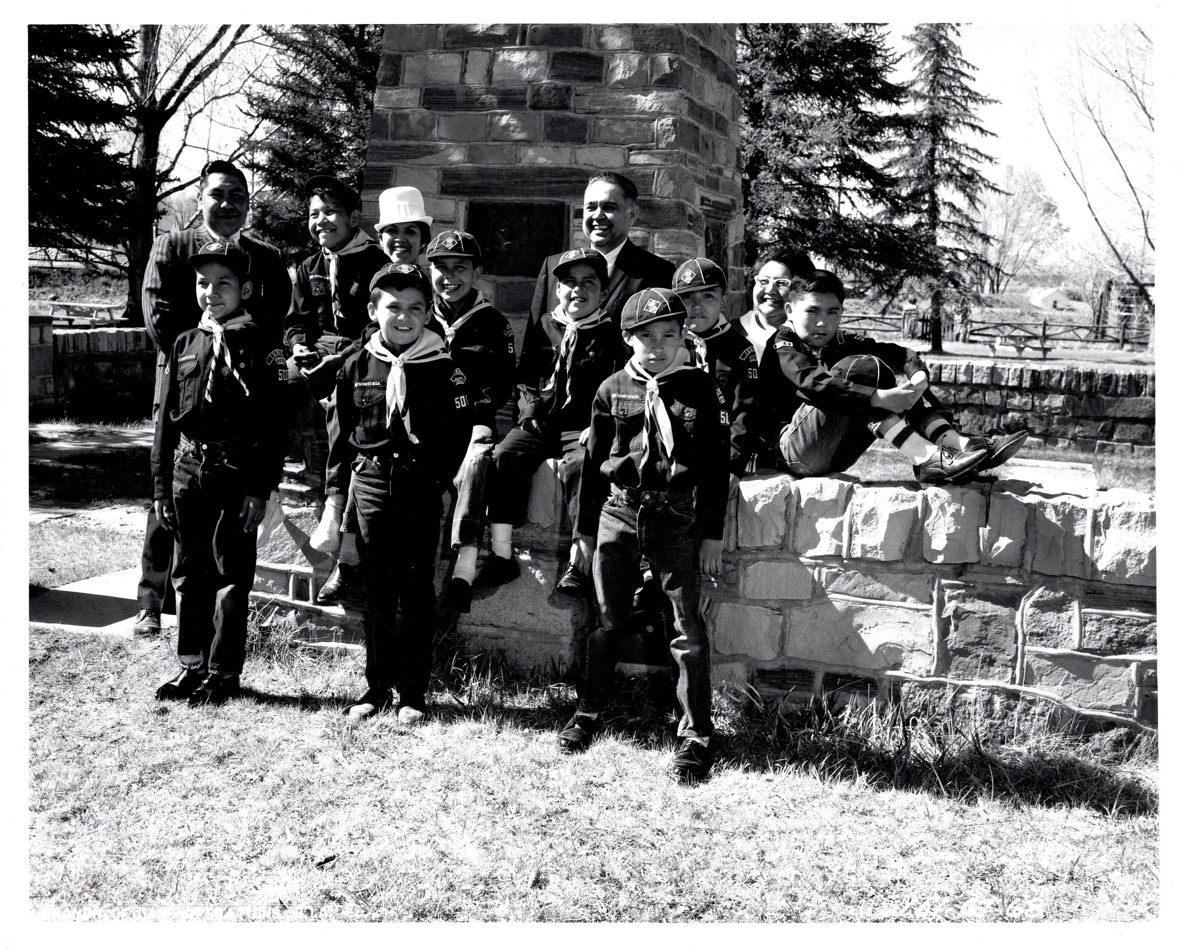 Black and white photographer of Robert Bennett standing with a Boy Scouts group in front of a brick monument. Some of the boys are sitting on the brick wall that surrounds the monument. There are two or three other adults in the back with Bennett.Collection