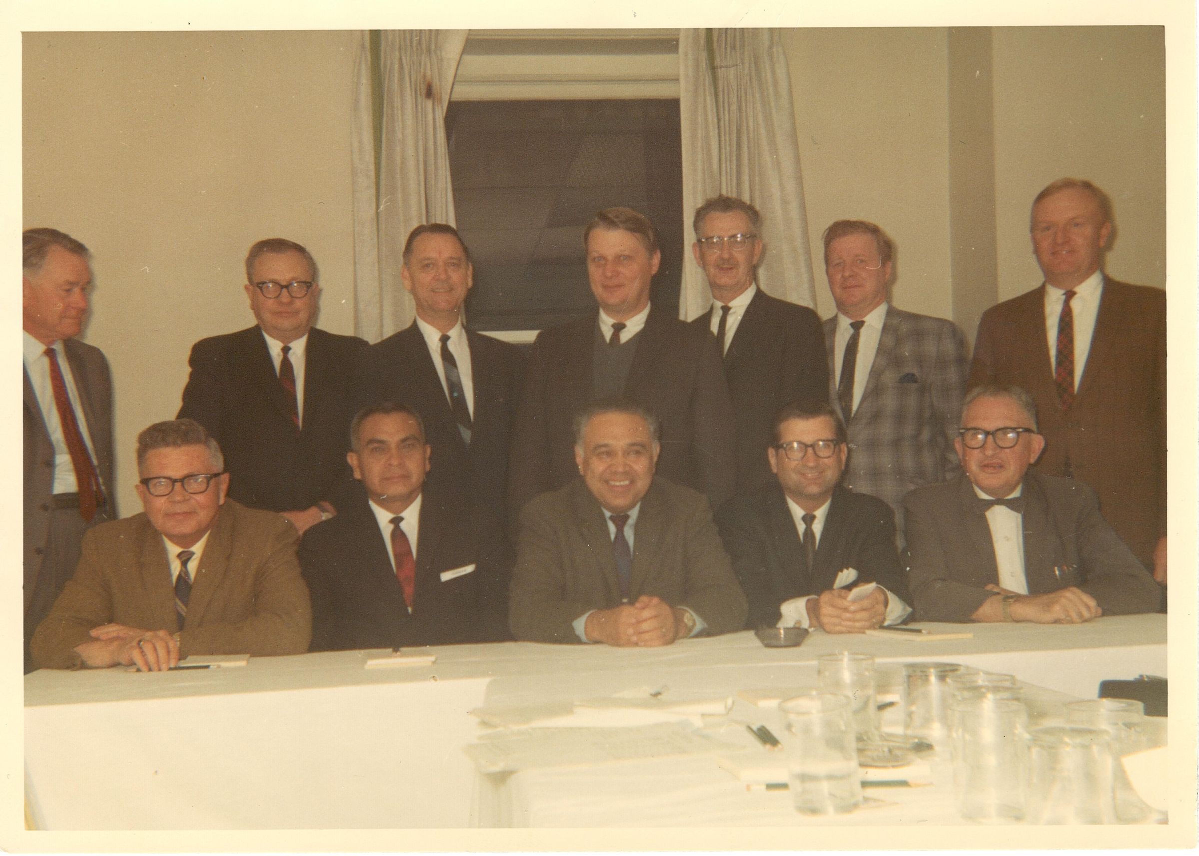 Colored photo of twelve (12) men: seven (7) standing and five (5) sitting with Robert Bennett sitting in the middle of the five seated men. All are wearing suits and ties.Photograph Details