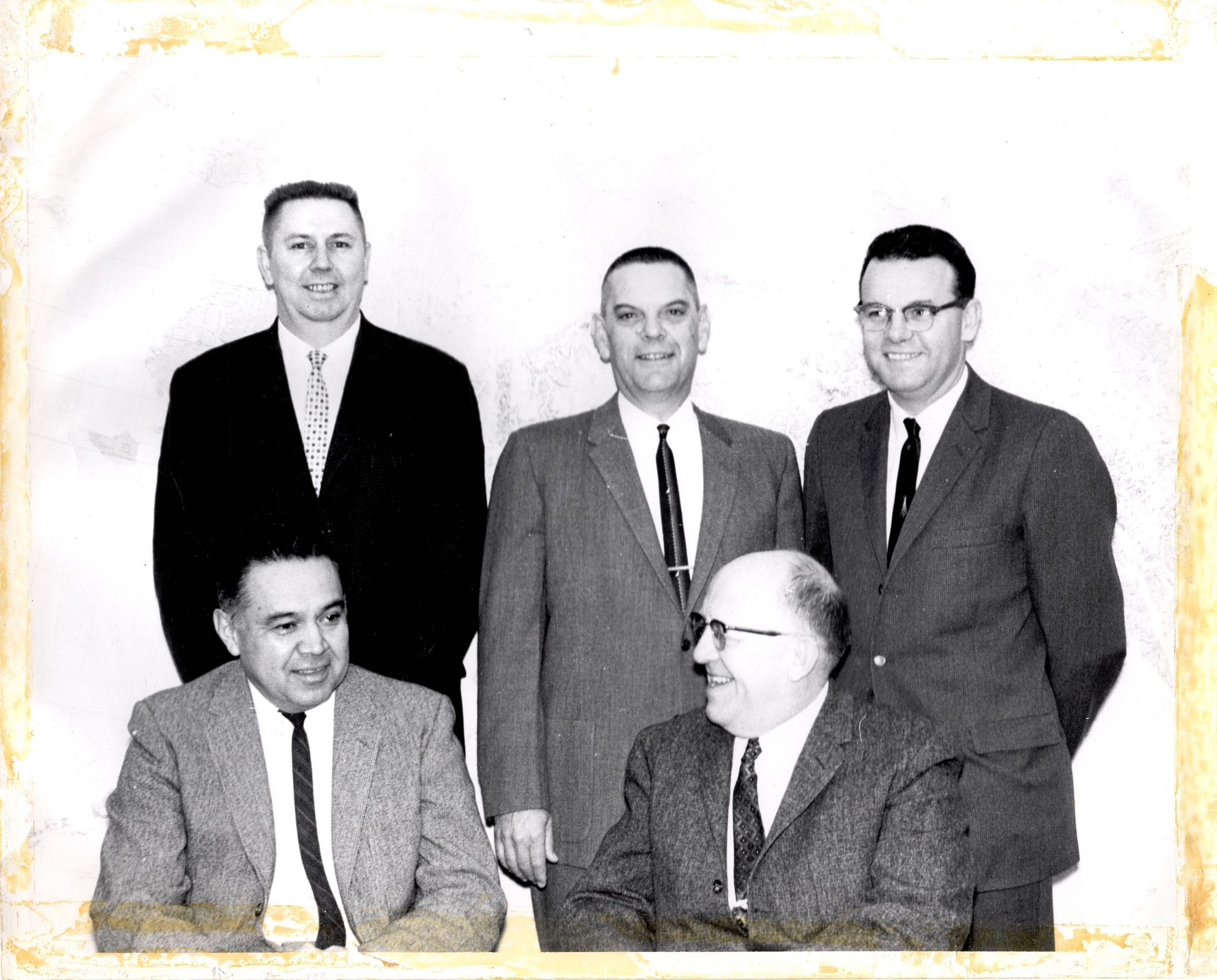 Black and white photograph of five men: three men standing in the back and two men sitting in front. The male sitting on the left is Robert Bennett.Photograph Details