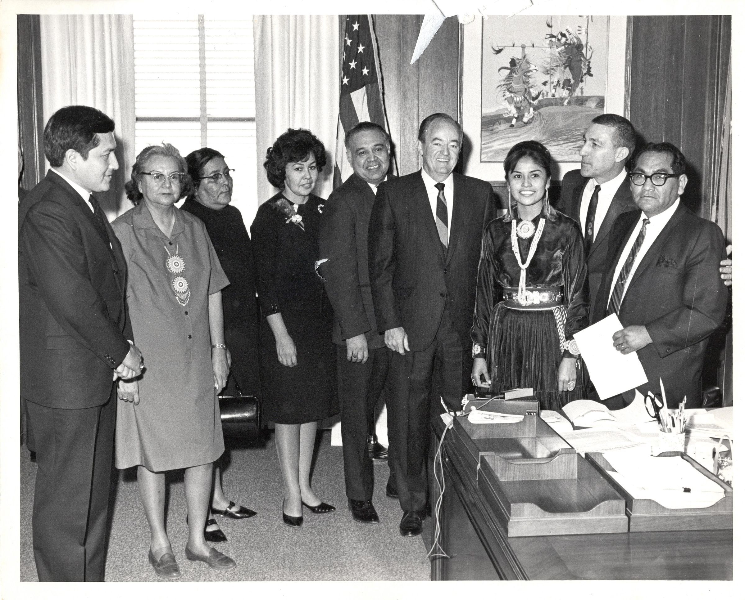 Black and white photograph of Robert Bennett standing shoulder to shoulder with eight other men and women. They are in an office with a Native drawing on the wall next to an American flag. There is one woman who is wearing traditional Southwest regalia and another on the other side of the group wearing a necklace of two beaded medallions. There are four women and five men total.Collection