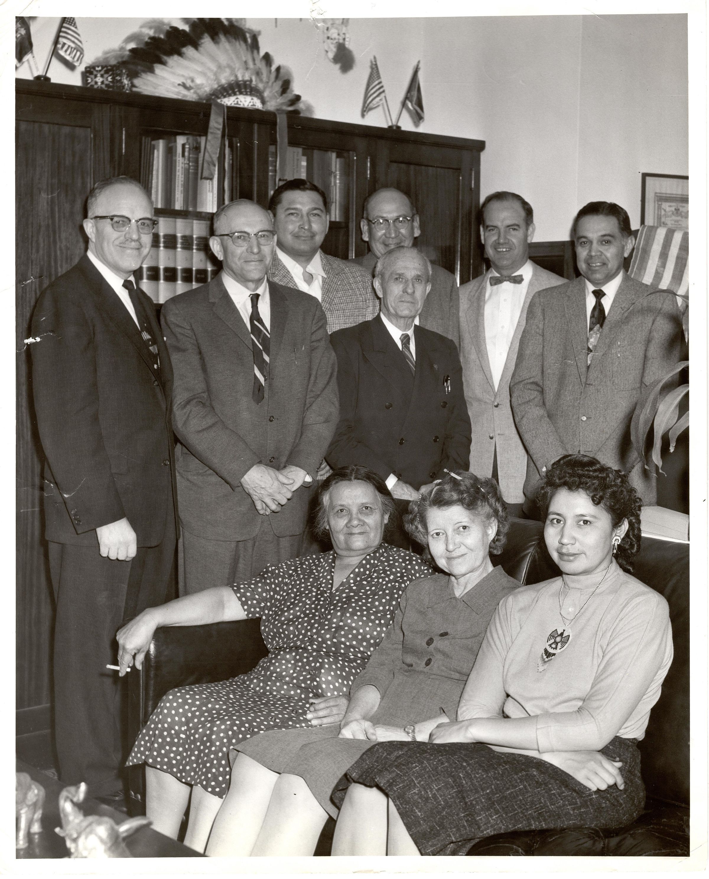 Black and white photograph of ten (1) people either standing or sitting in front of a bookcase with a headdress on top. The three women are sitting in the front and the seven men are standing in the back. The last man on the right is Robert Bennett. Written in ink on the back, top corner is "Lower Brule, Tribal Council".Photograph Details