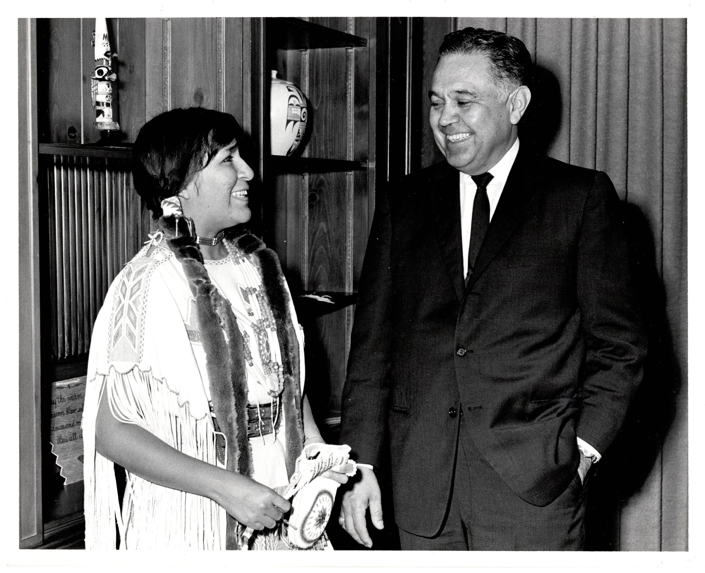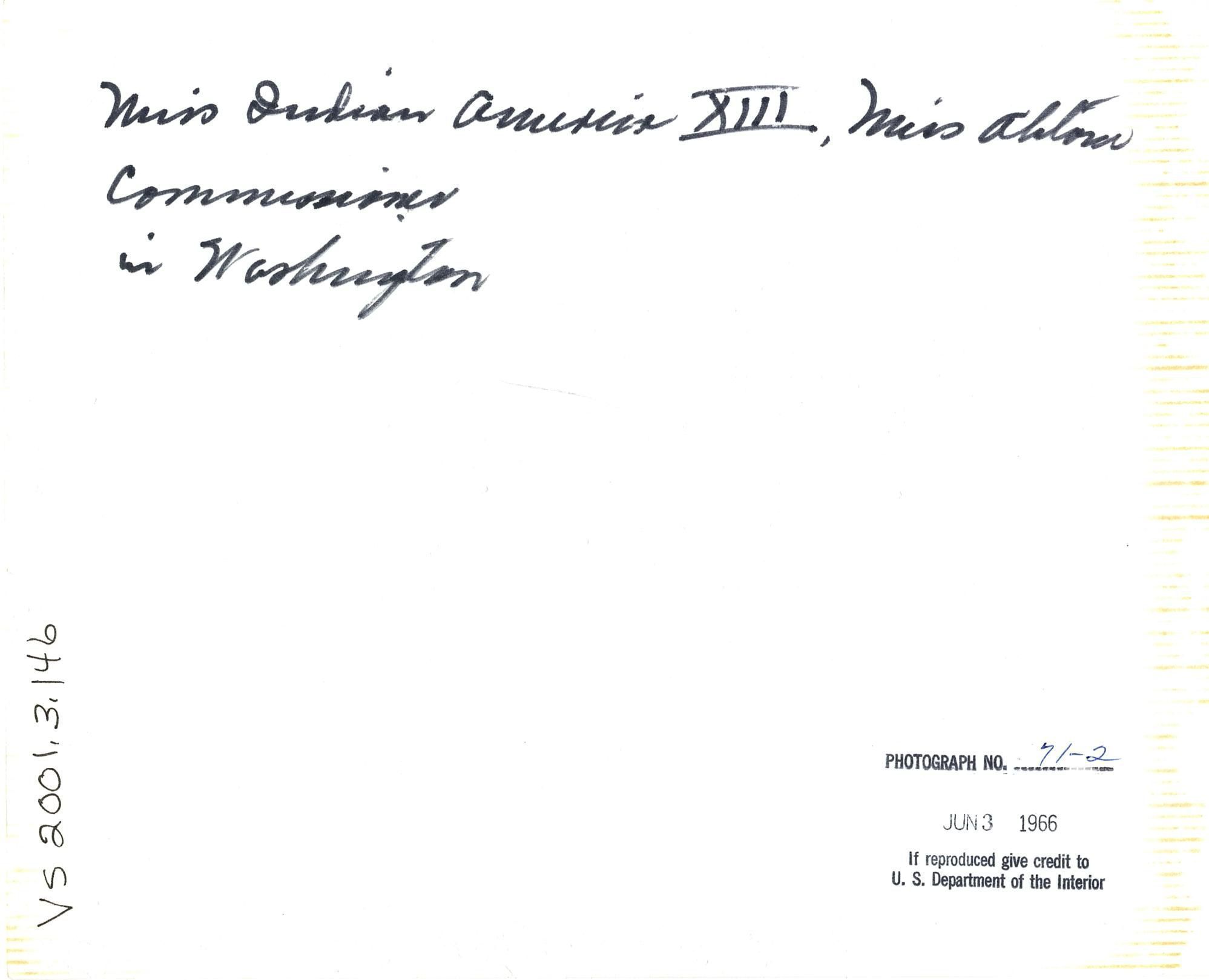 Black and white photo of Robert Bennett standing next to a woman in traditional regalia, smiling at each other. The back reads "Miss Indian America XIII, Miss Ahton, Commissioner, in Washington."Photograph Details