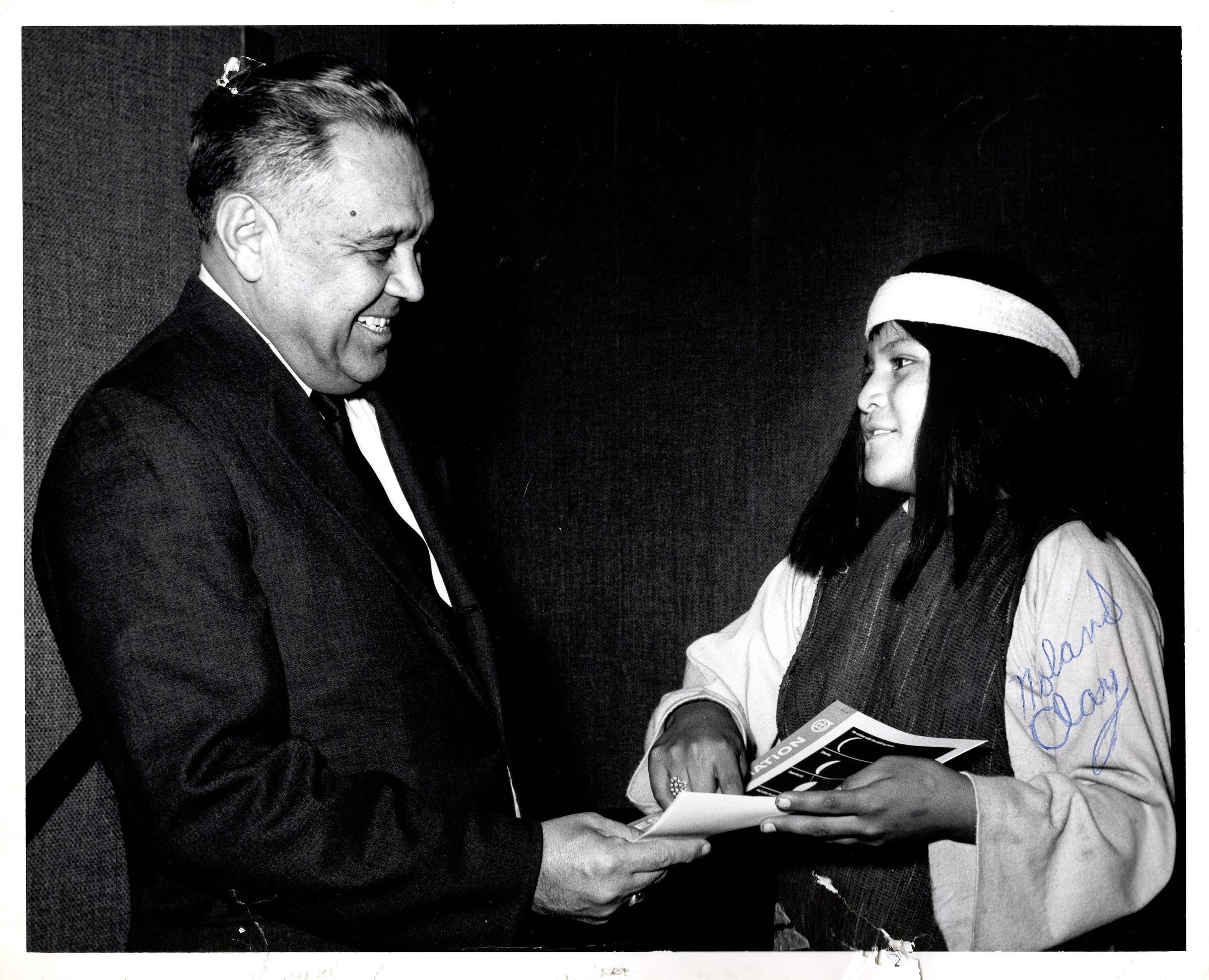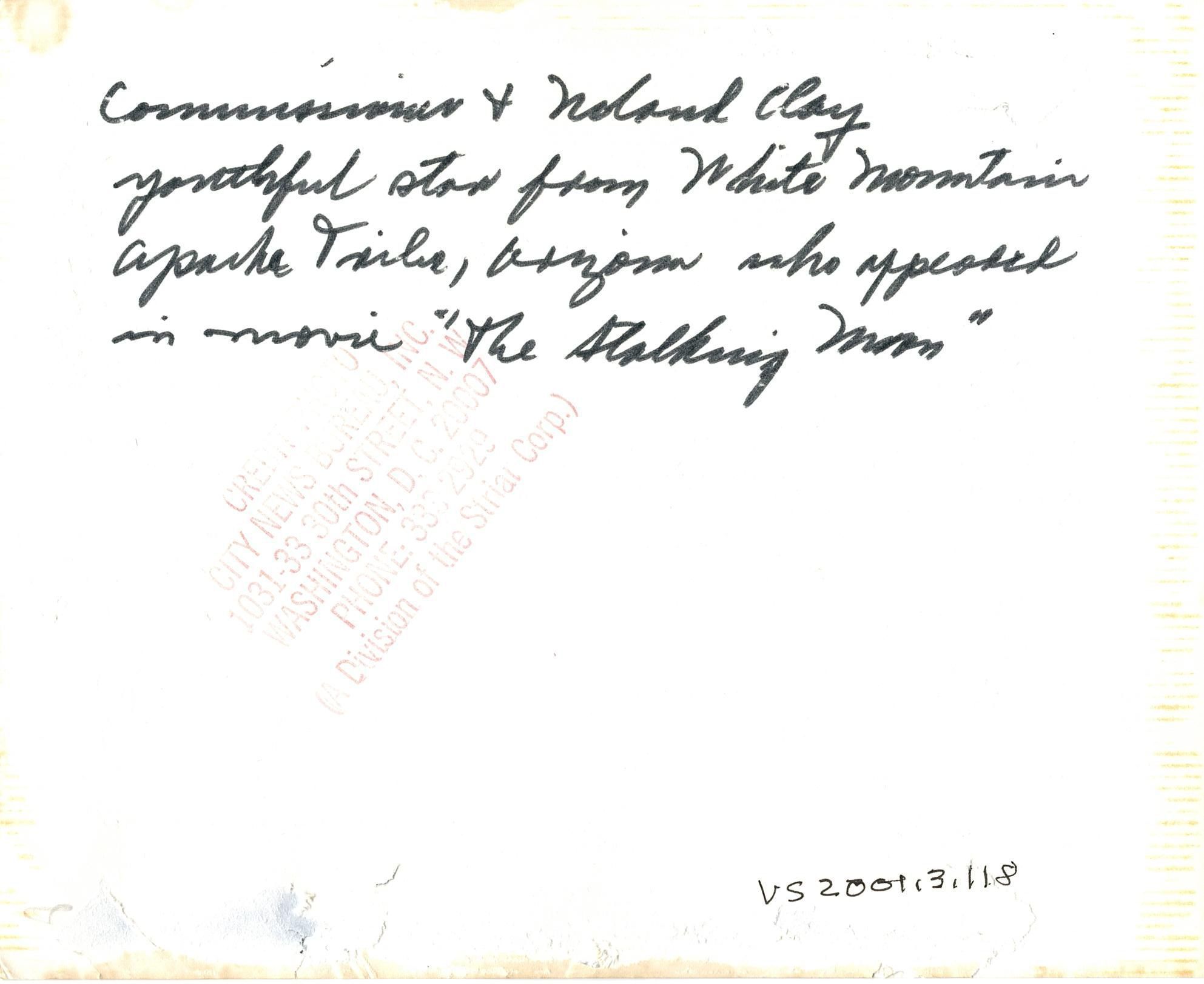 Black and white photograph of Robert Bennett handing a piece of paper to a young male. Written in blue ink on the sleeve of the boy is "Noland Clay". Written in black ink on the back is "Commissioner and Noland Clay youthful star from White Mountain Apache Tribe, Arizona who appeared in moving 'The Stalking Moon'."Photograph Details