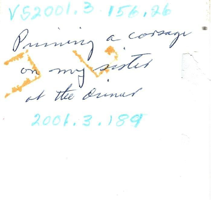 Written on the back of the photograph in black ink "pinning a corsage on my sister at the dinner."Photograph Details
