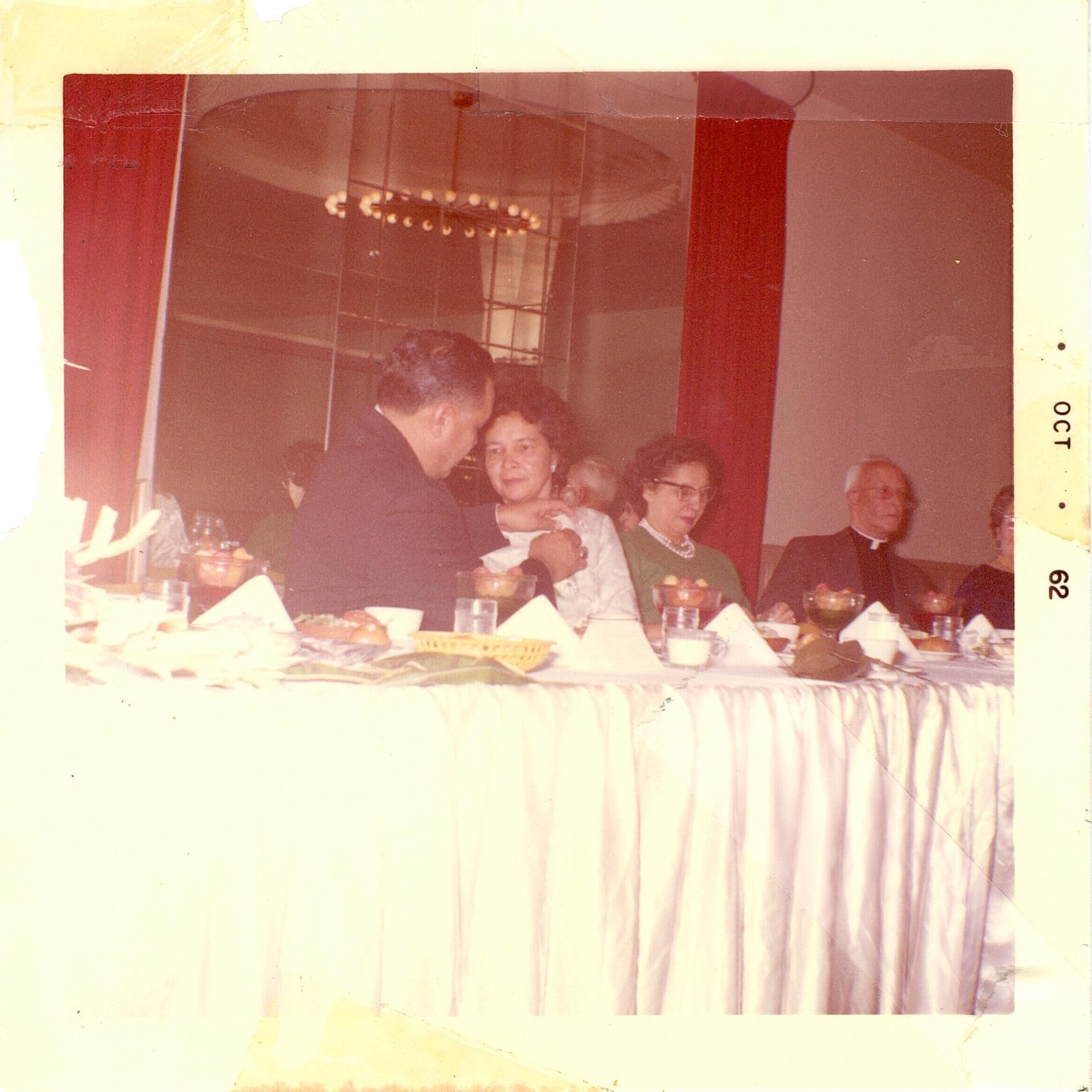 Colored photograph of Robert Bennett pinning a corsage on his sister's dress. They are sitting at a table with 3 (three) other people, 1 (one) being a minister or reverend or priest. There is a large mirror with red curtains behind them.