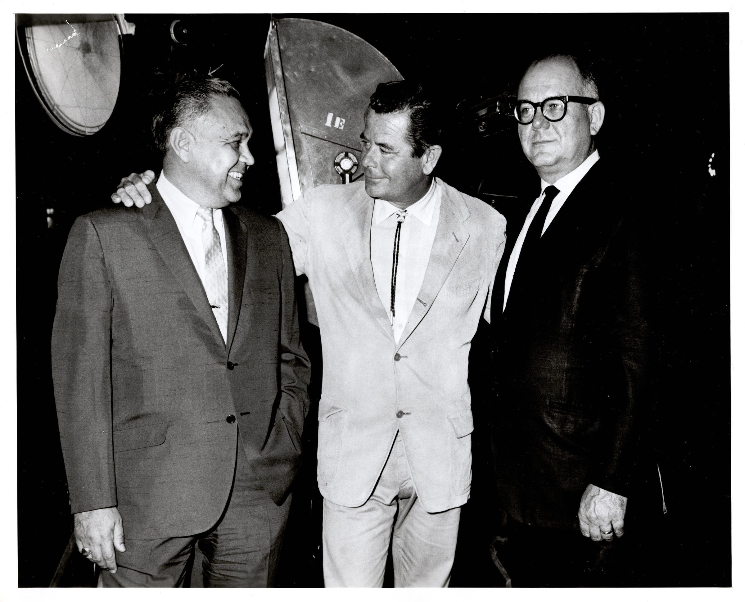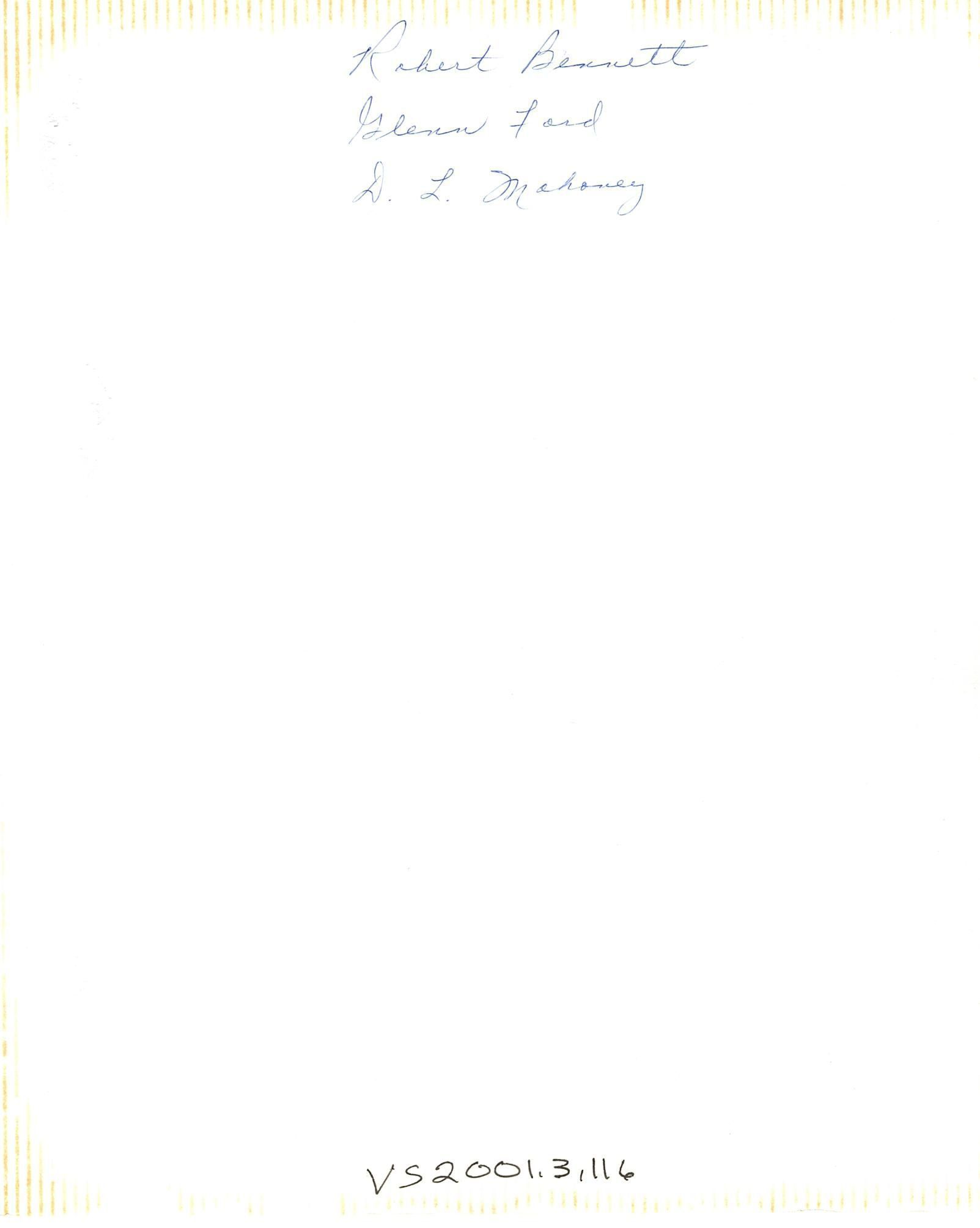 Black and white photograph of Robert Bennett with two other men in suits. The middle man is wearing a bolo tie, the other two are in suits and ties. Written in ink on the back " Robert Bennett, Glenn Ford, D.L. Mahoney".Photograph Details
